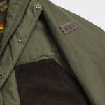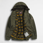 Waxed cotton British Millerain pea coat, water-repellent and wear-resistant, with a jacquard wool lining featuring folk patterns. Equipped with a detachable hood with adjustable drawstring and throat latch for extra protection. Front utility pockets inspired by MCS archive garments, finished with corduroy details. The design is completed by an inner collar and applied inner pocket, cuffs with vintage buttoning, and a front closure with hidden zip and snap buttons for a clean look. Leather label on the left sleeve. Made in Italy with the quality of local craftsmanship.