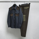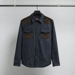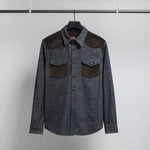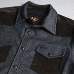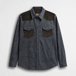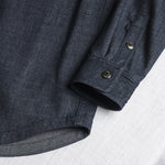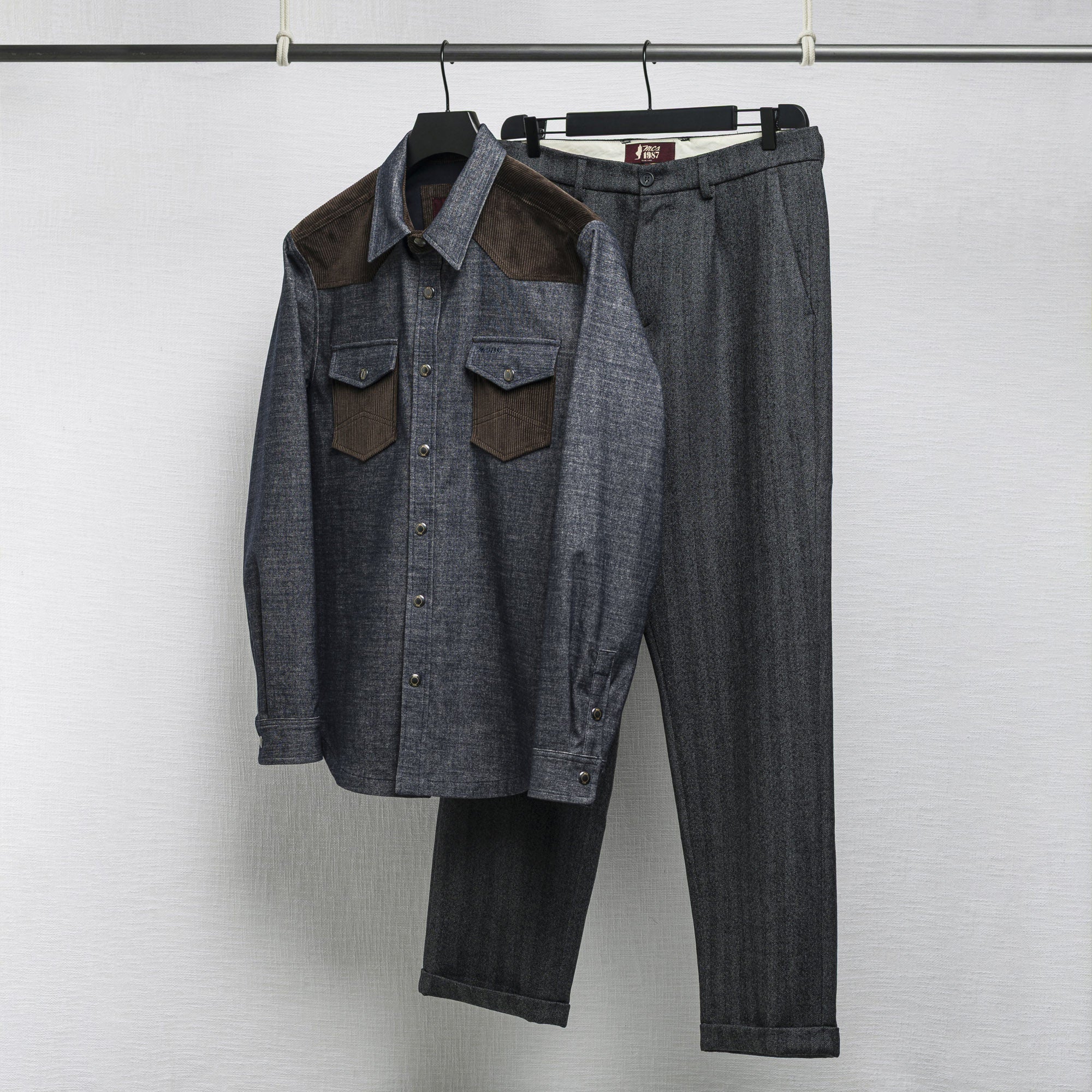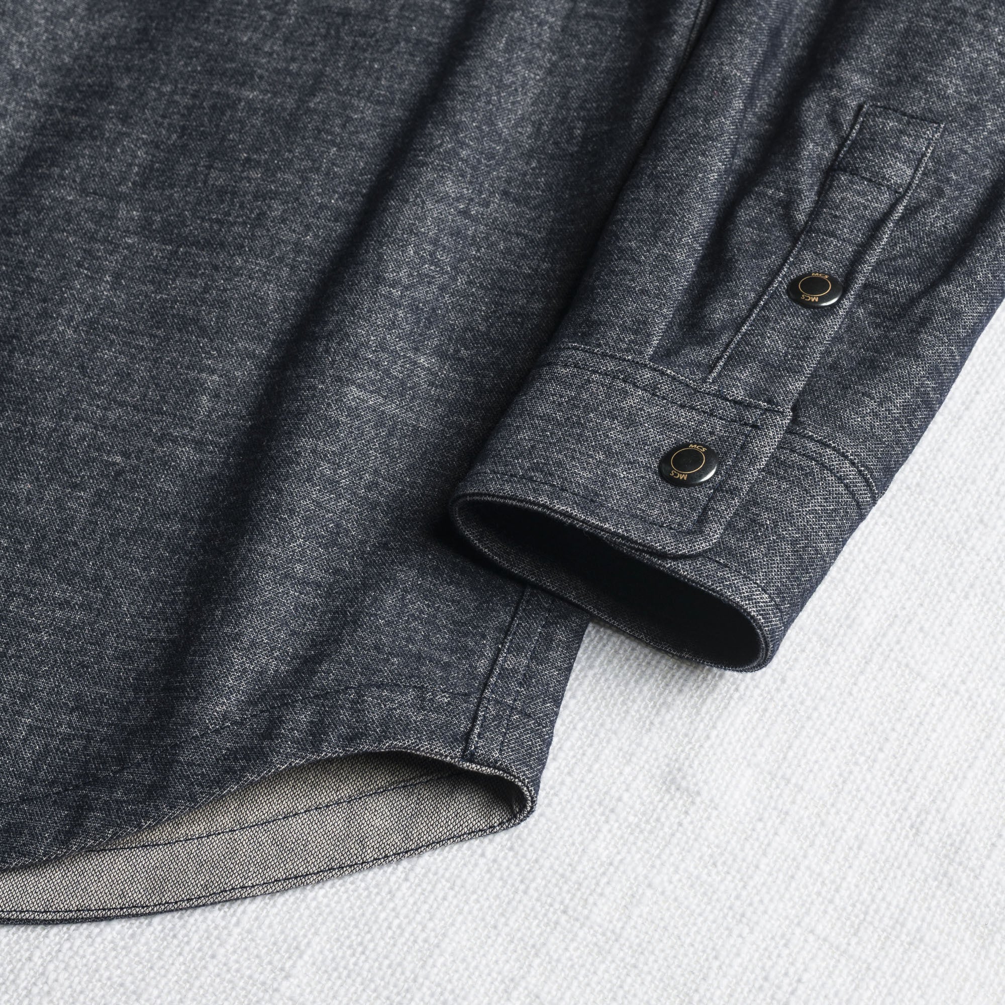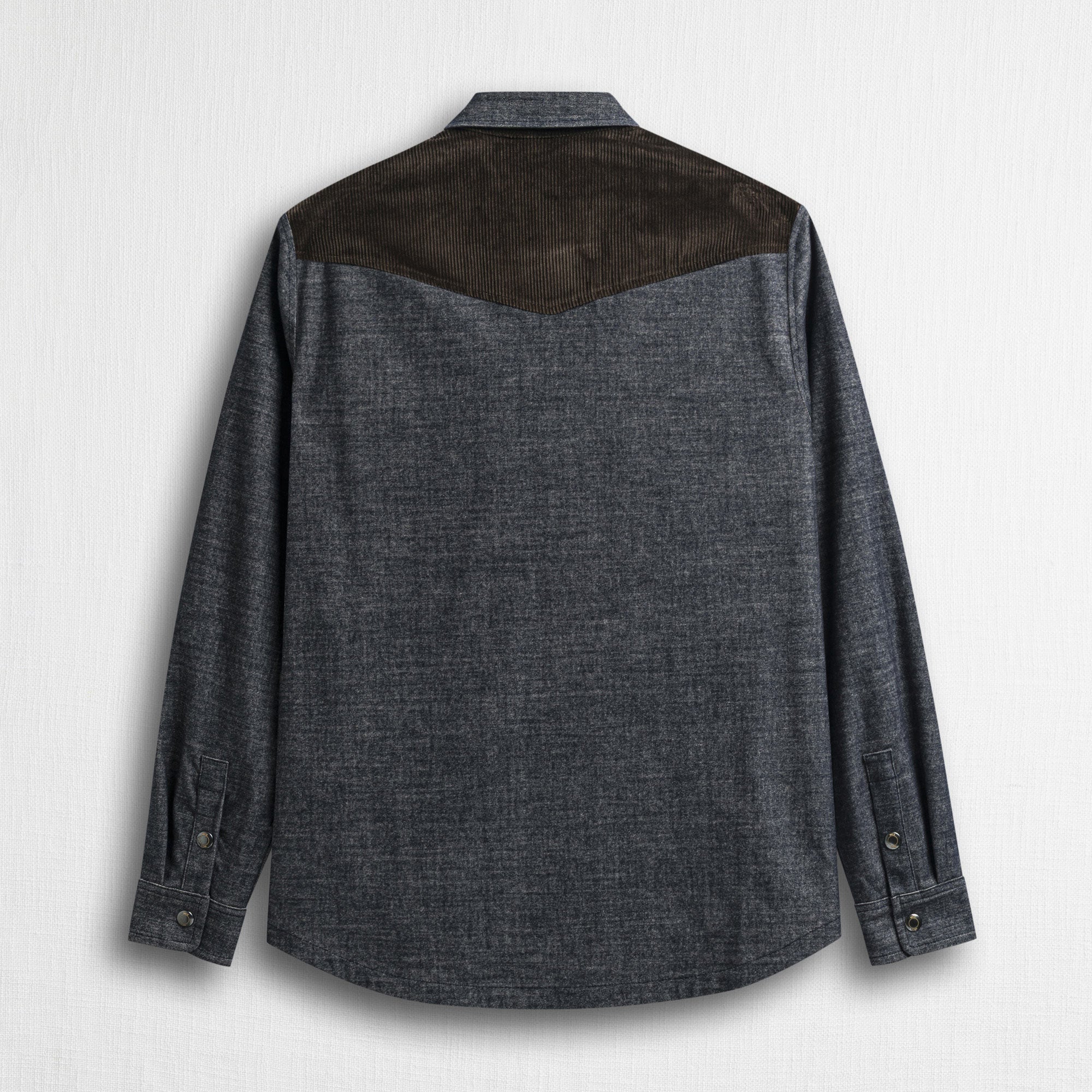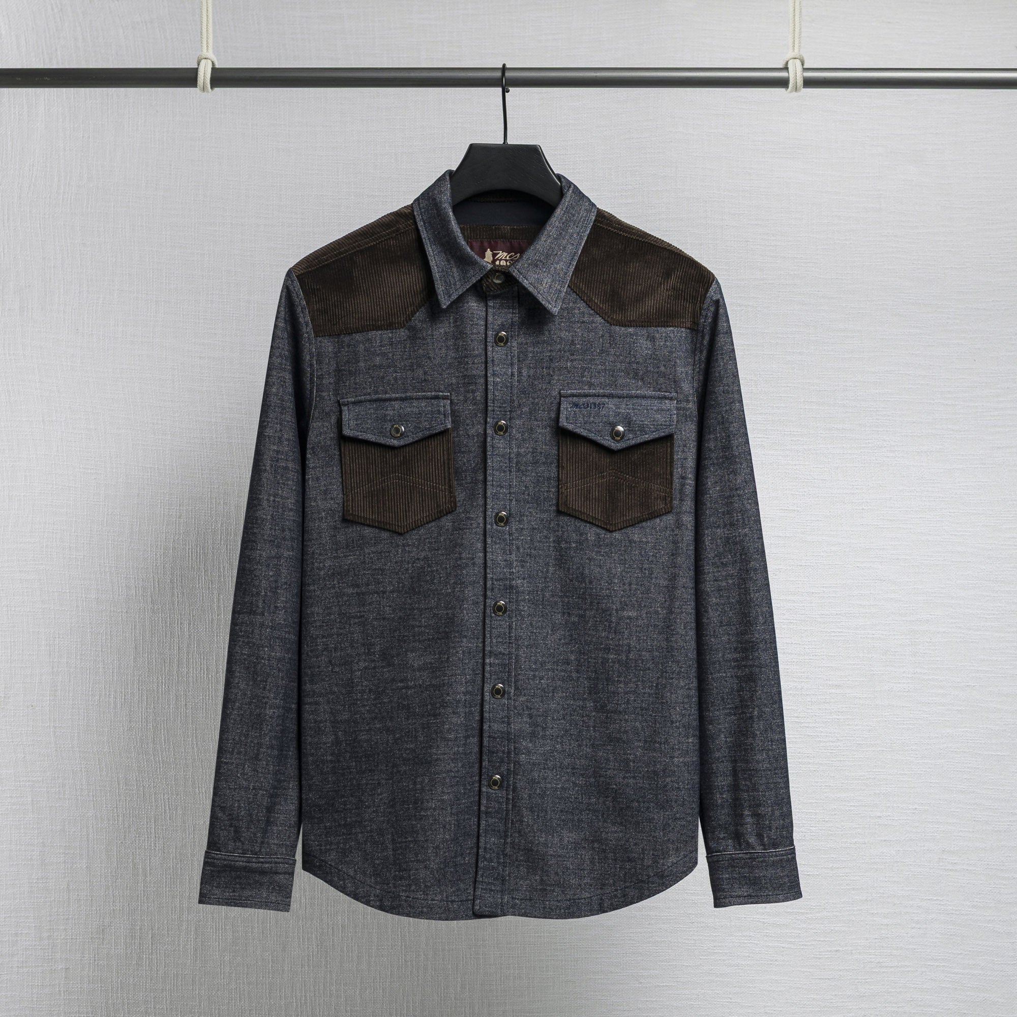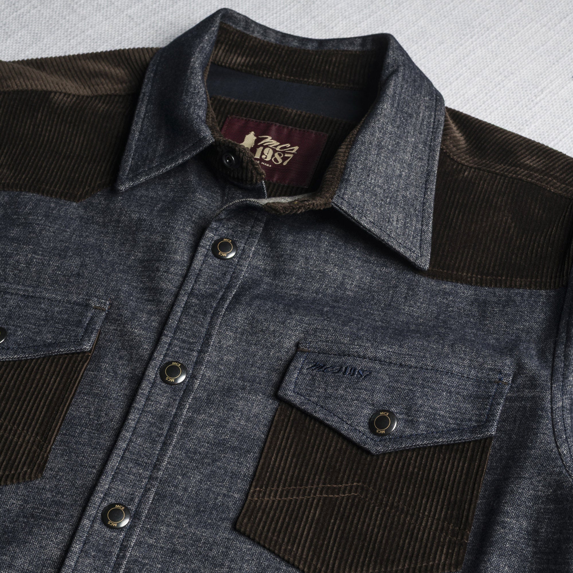 Western shirt in very soft cotton flannel with a denim effect, achieved through the skillful use of yarn colors. The design is enhanced by shaped shoulder pads and yoke, and classic patch pockets with flaps, all made of velvet for a material contrast that adds a distinctive touch. Closure with metal snap buttons branded MCS and MCS1987 embroidery on the left flap for a detail of authenticity. A shirt with a workwear soul and authentic Italian tailoring.