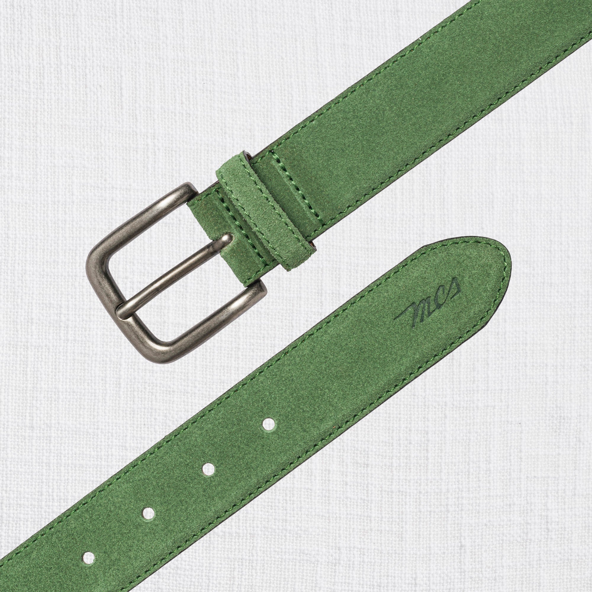 Men's Light Green suede belt made of genuine leather, lightly waxed to enhance the natural texture of the leather. The square metal buckle and matching loop complete this men's belt with refined details that give it an authentic character. The MCS logo embossed on the tip adds a distinctive touch to a simple yet sophisticated accessory, perfect for finishing spring and summer looks with a stylish flair.