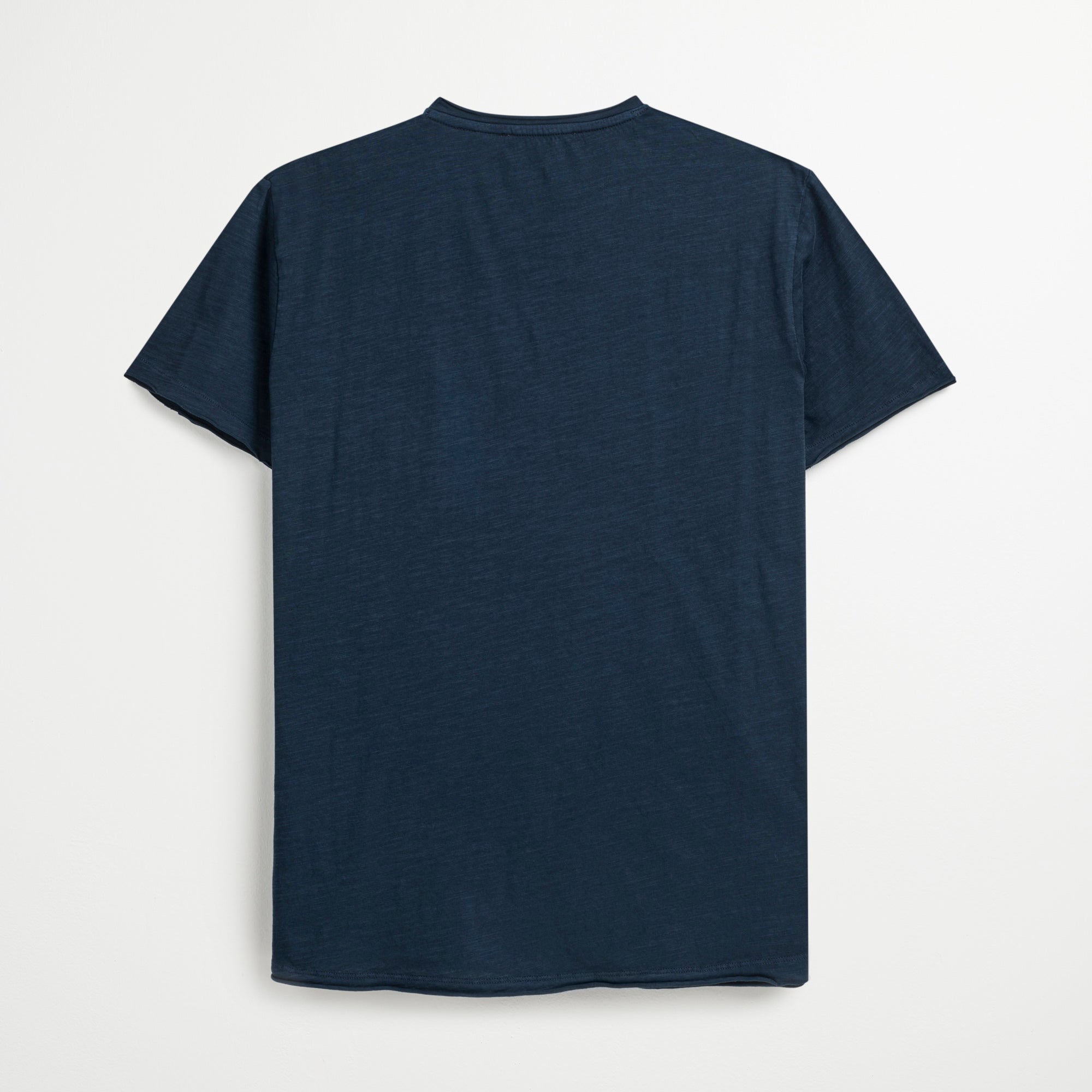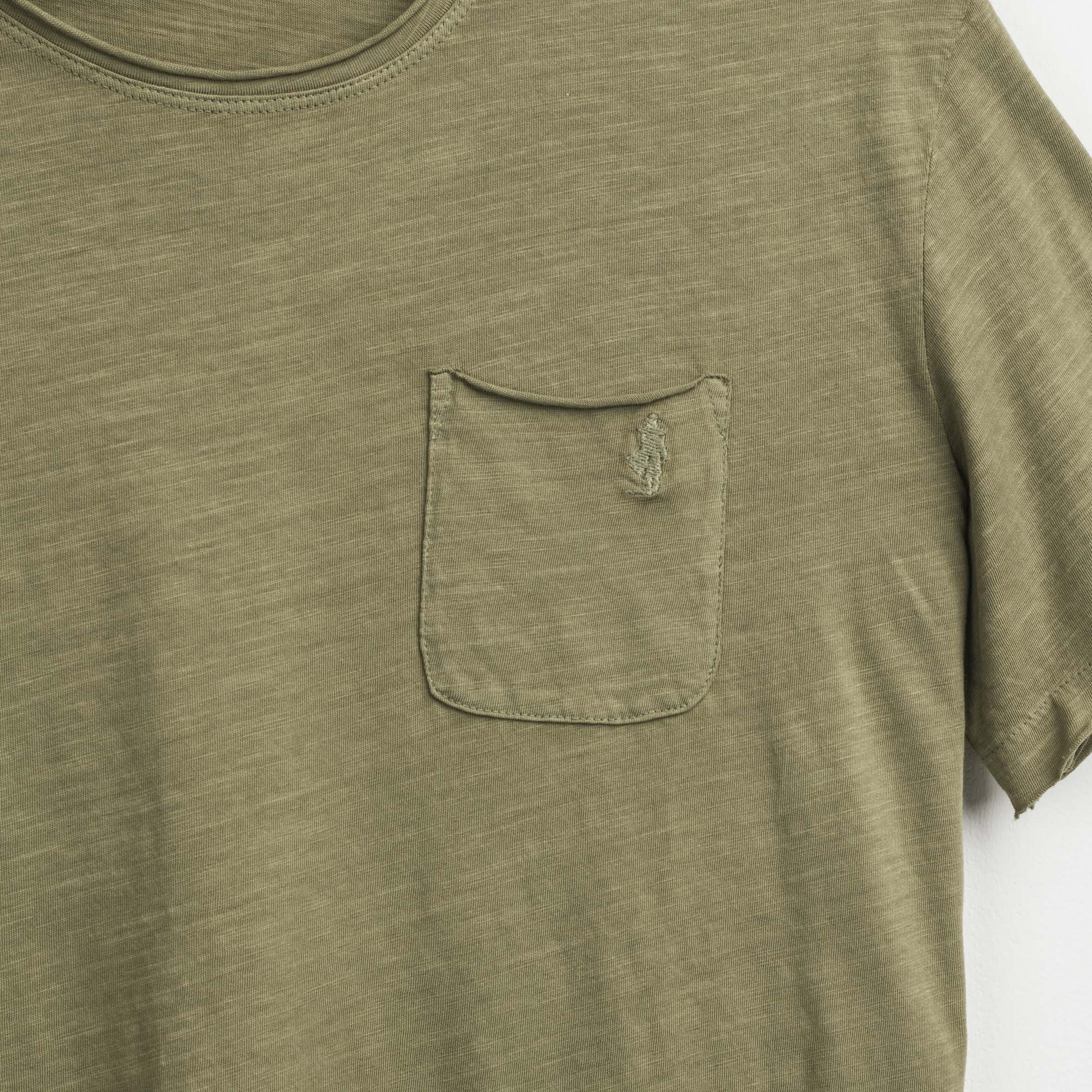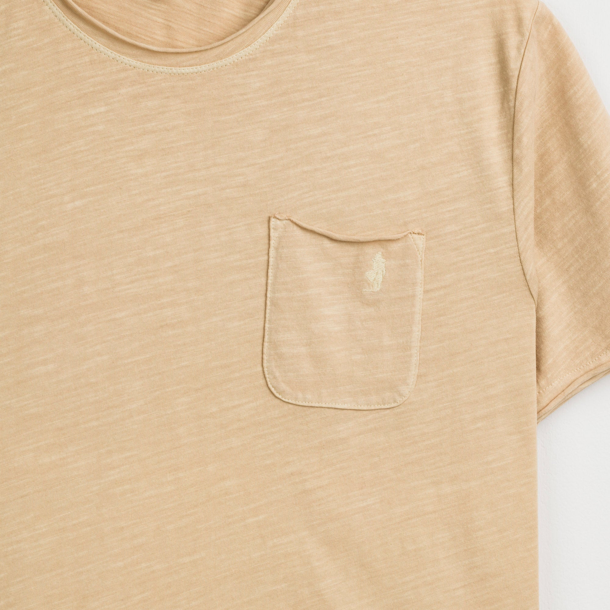 T-shirt in flame cotton jersey dyed with pigment, a treatment that gives the garment an authentic and worn look thanks to the subtle color nuances. The irregular texture of the flame cotton adds depth and character to the fabric, making it perfect for a casual style with a vintage touch. The design is enhanced by raw-cut details on the neckline and hem for a bold look, as well as an applied pocket that emphasizes its relaxed aesthetic. The enzymatic treatment provides a soft and comfortable hand, for a natural fit that is pleasant to wear.