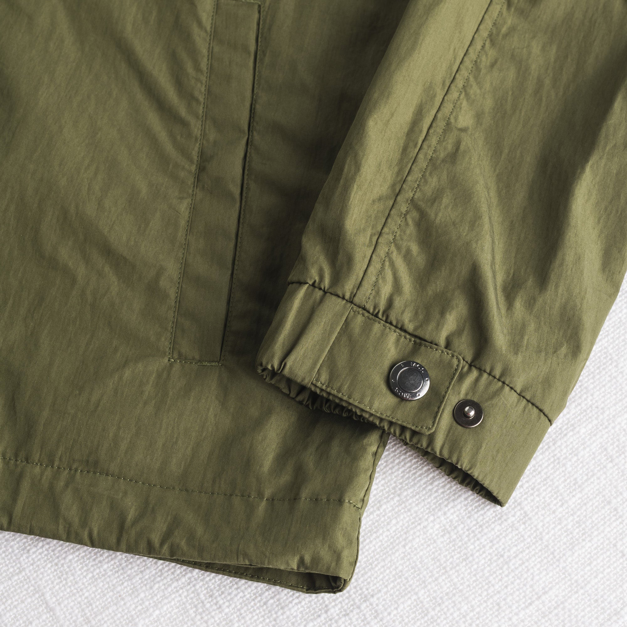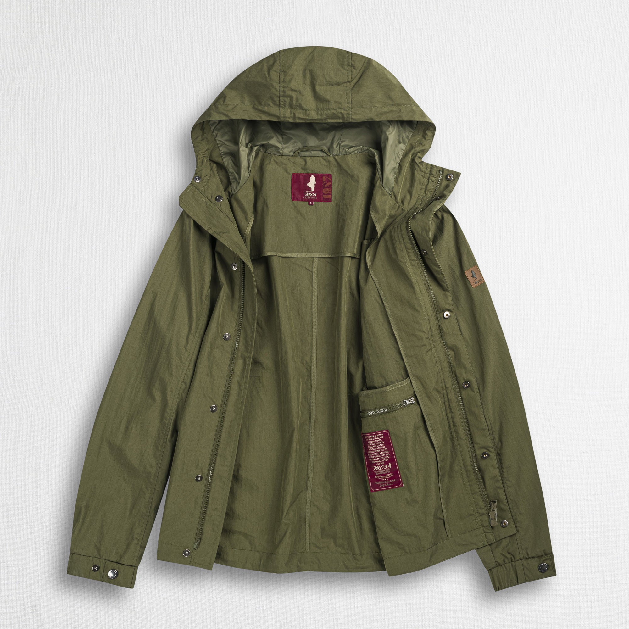 Men's windproof rain jacket in Dark Olive cotton nylon with water-repellent treatment, ideal for outdoor walks even in light rain. The design features details that provide practicality and comfort: lined hood, front opening with double-slider zipper, chest pocket, two lower pockets, and an inner pocket. The leather patch on the sleeve adds a distinctive touch to the look. A lightweight, essential, and timeless garment.