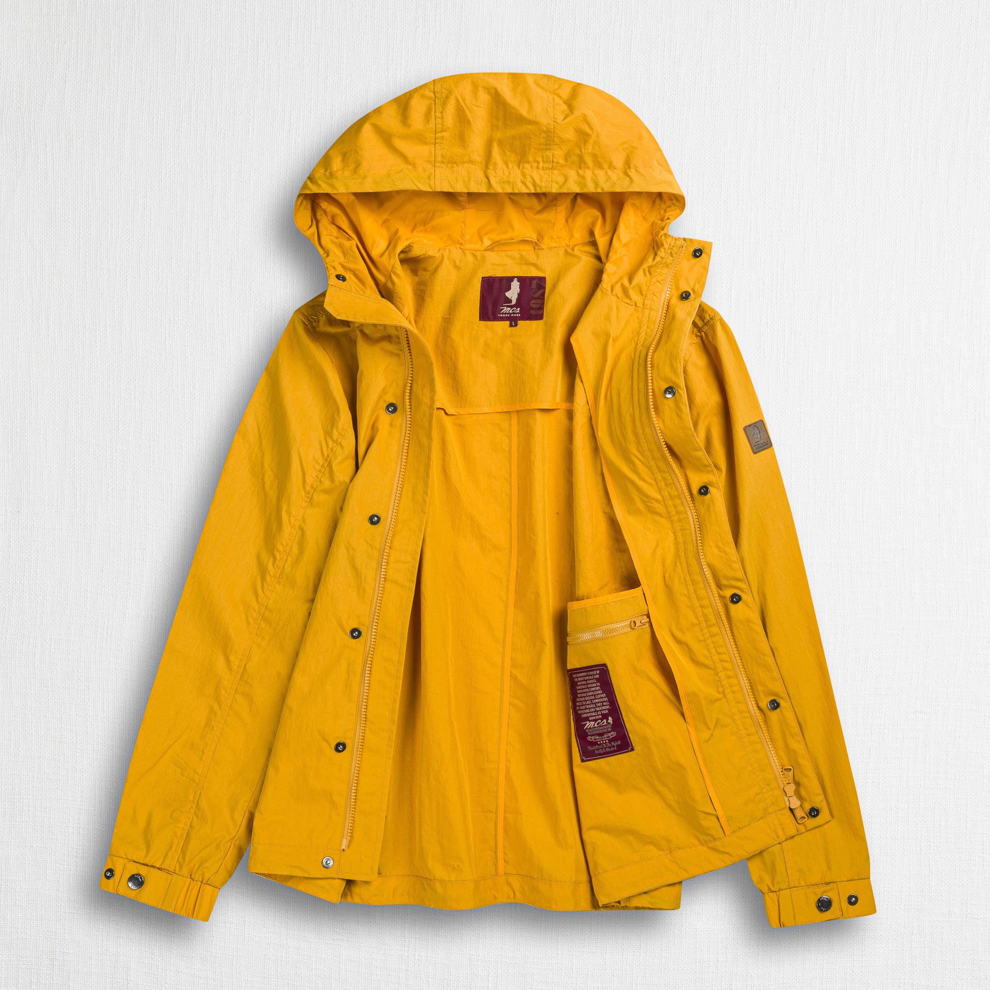 Men's windproof rain jacket in Gold Yellow cotton nylon with water-repellent treatment, ideal for outdoor walks even in light rain. The design features details that provide practicality and comfort: lined hood, front opening with double-slider zipper, chest pocket, two lower pockets, and an inner pocket. The leather patch on the sleeve adds a distinctive touch to the look. A lightweight, essential, and timeless garment.