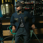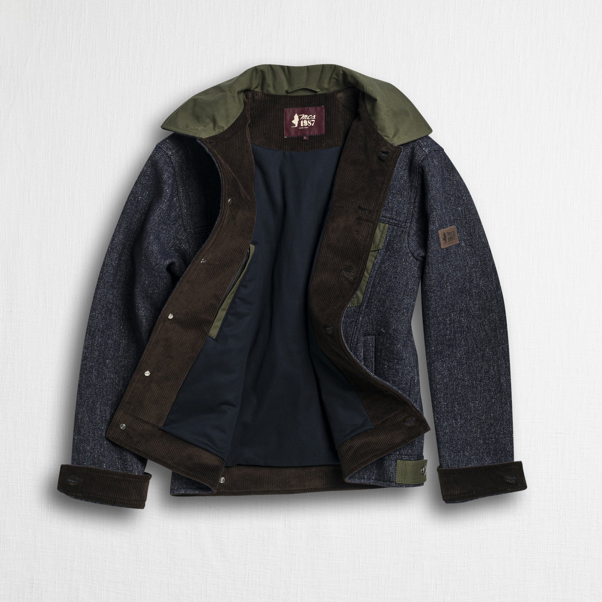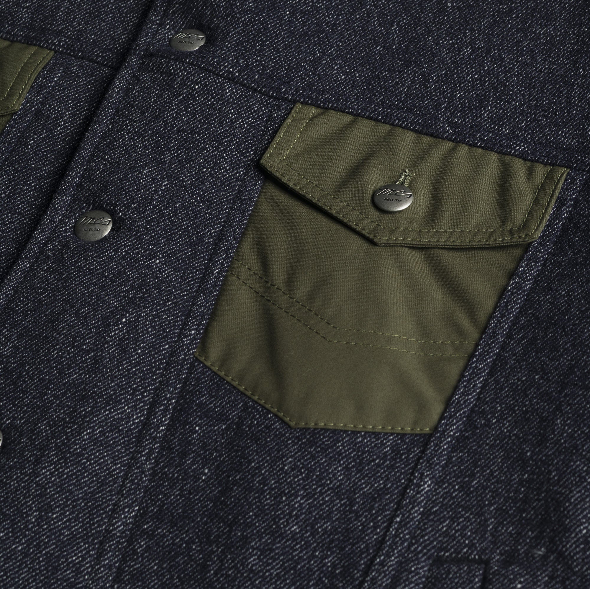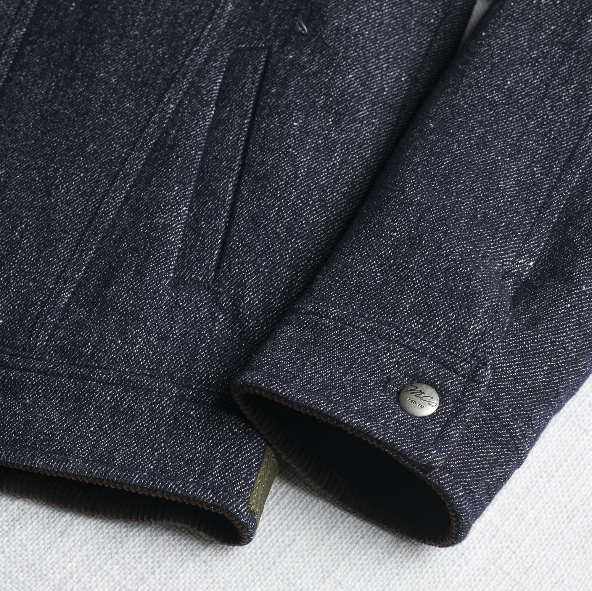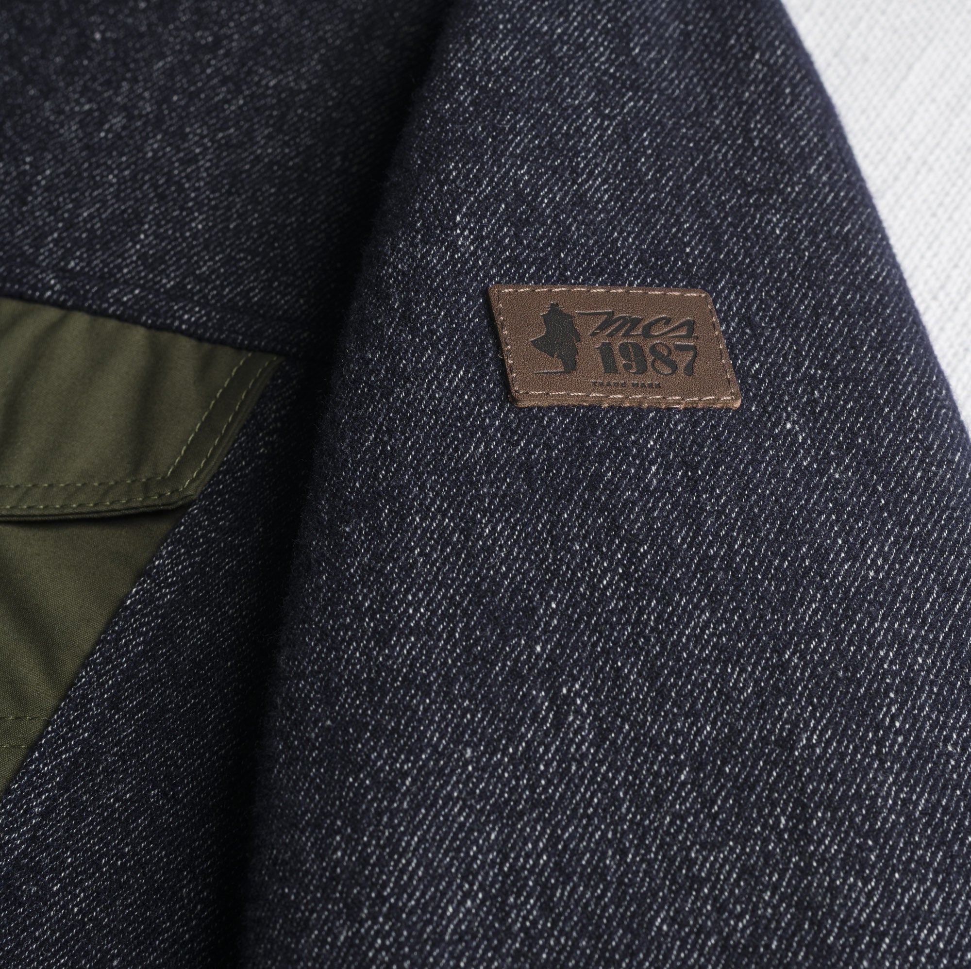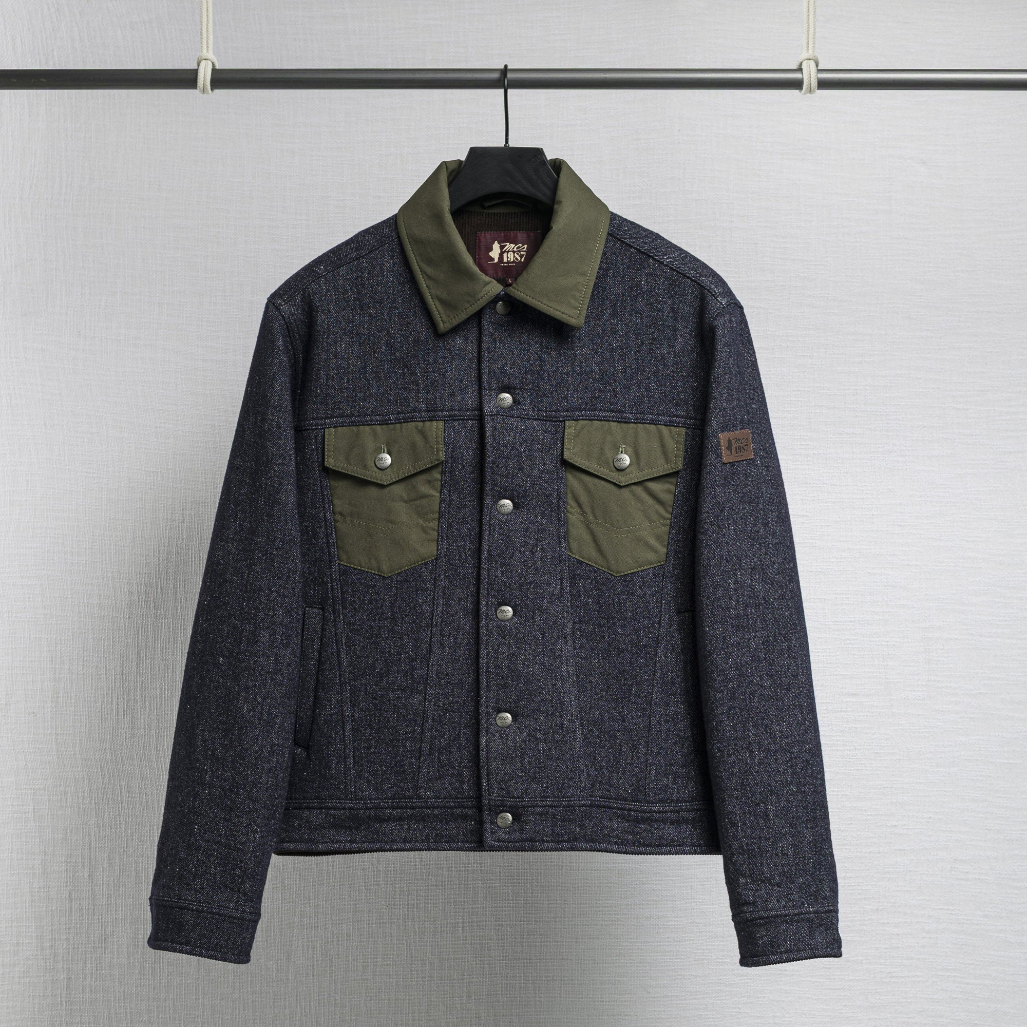 Jacket reinterpreting the classic trucker jacket model, made of a wool-linen blend fabric with a denim effect. Collar and pockets with flap in British Millerain waxed cotton, water-repellent and highly resistant to wear. Fully lined interior for better fit and thermal comfort. Finished with a leather label applied to the left sleeve and front closure with custom metal buttons featuring the MCS logo. Made in Italy with artisanal care.