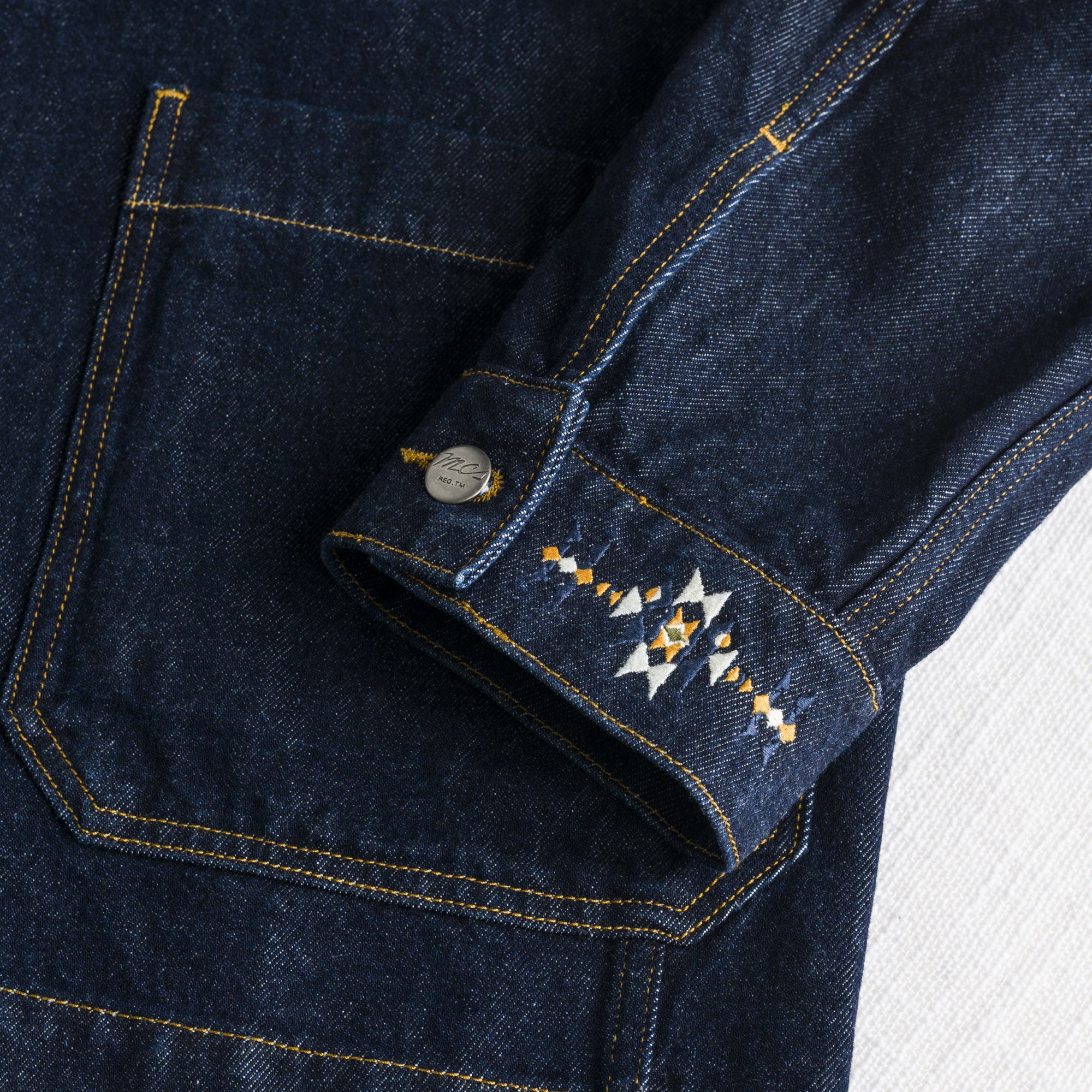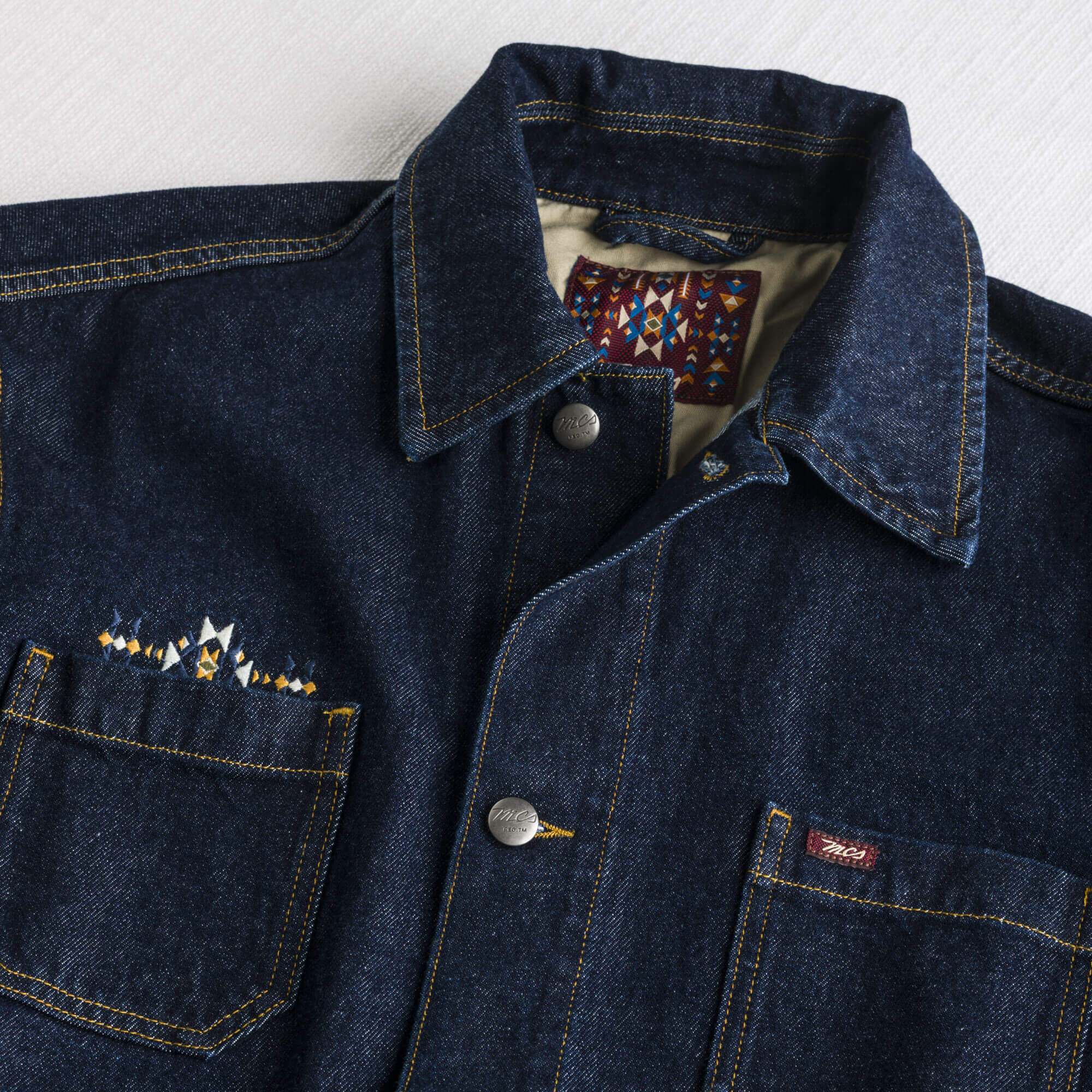 Men's work jacket in Dark Blue raw denim for a contemporary attitude look. Made from raw denim, a fabric that has not undergone pre-washing or shrinking during production. This workwear jacket reflects the authentic character of raw jeans but with a modern twist thanks to its bold design featuring a pointed collar, branded stud buttons, and four patch pockets. Decorative folk embroidery above the front pocket adds a distinctive detail, making this work jacket a standout piece suitable for classic looks that stand out.