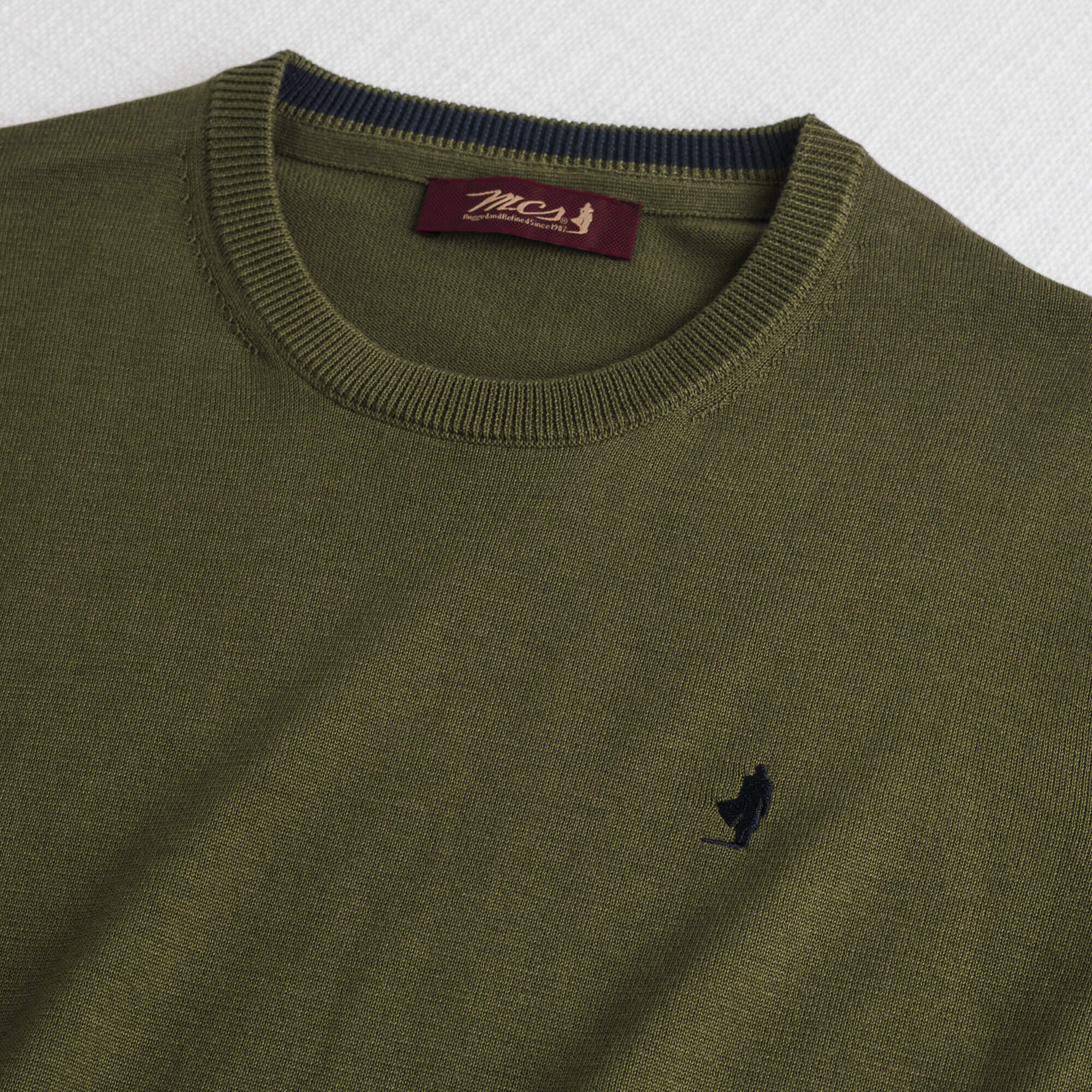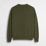 Men's crew neck sweater in solid Dark Olive, made of 100% lightweight cotton with a 12-gauge knit, the perfect balance between lightness and comfort for the transitional seasons. The yarn-dyeing ensures rich, long-lasting colors and a defined texture, while the enzymatic wash gives a soft, natural feel. Essential yet distinctive, this men's cotton crew neck sweater is completed with the refined Rider MCS embroidery on the chest and a contrasting color inside the collar for a detail that makes a difference.