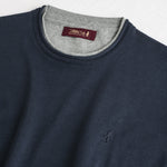 Men's Navy Blue crew neck sweater in fine 12-gauge cotton, enhanced with jersey details. The 100% fine cotton yarn ensures optimal comfort in spring and summer. The classic solid crew neck design is enriched with jersey details on the collar and hem for a stylish touch and a refined layering effect. The Regular fit offers a comfortable yet elegant silhouette, suitable for any occasion. The Rider MCS embroidery on the chest signs this essential and versatile piece in its simplicity.