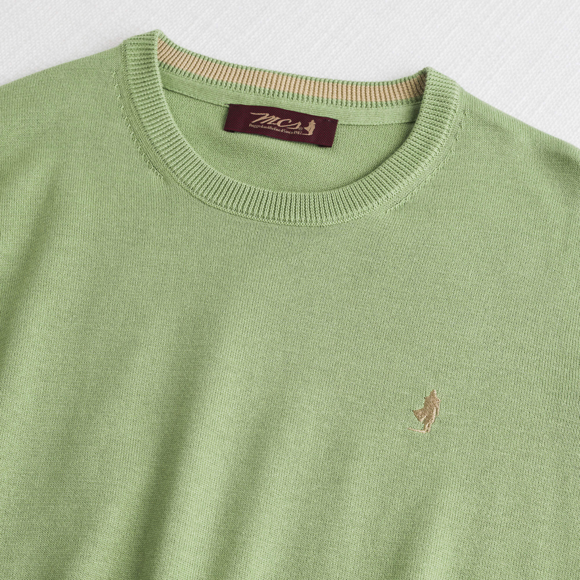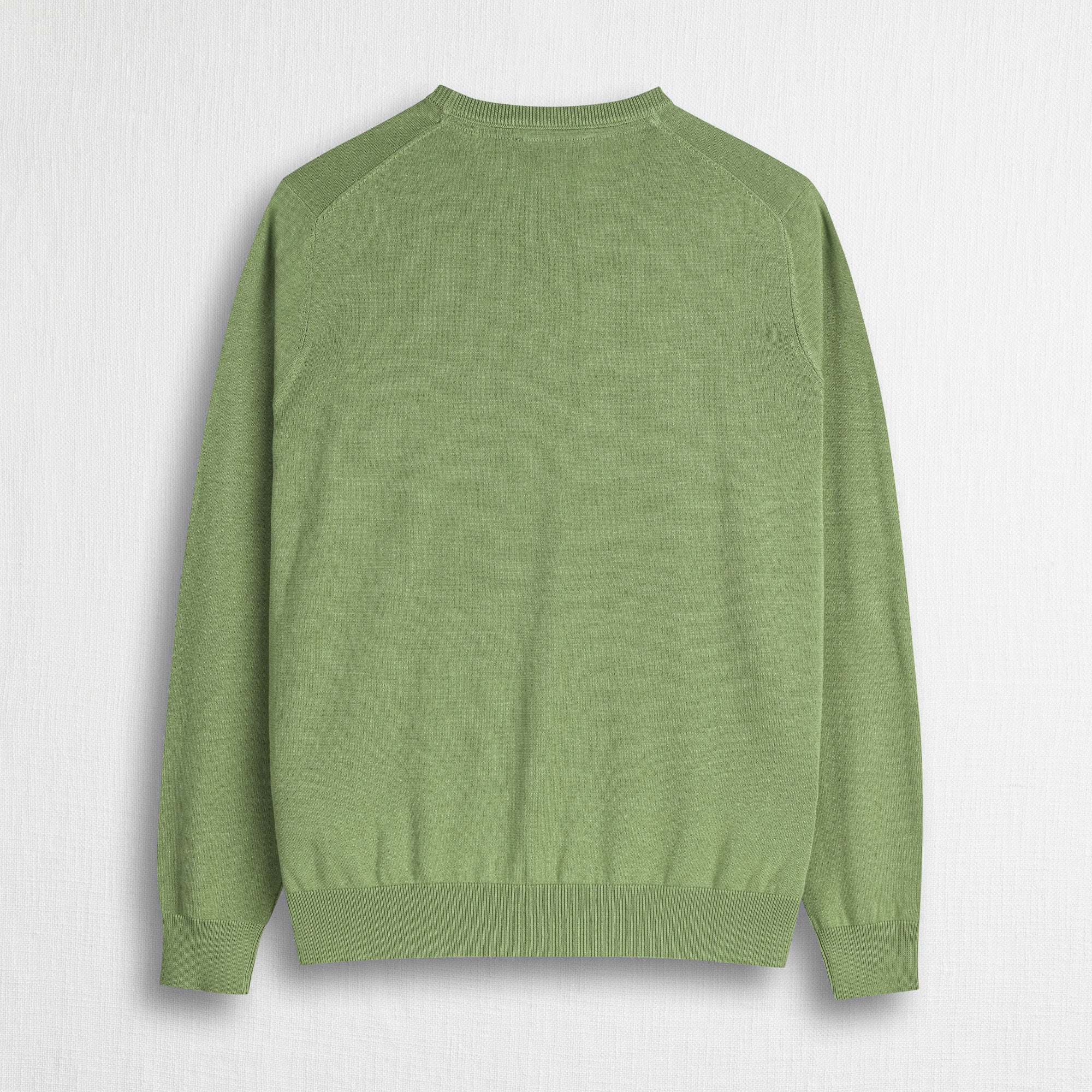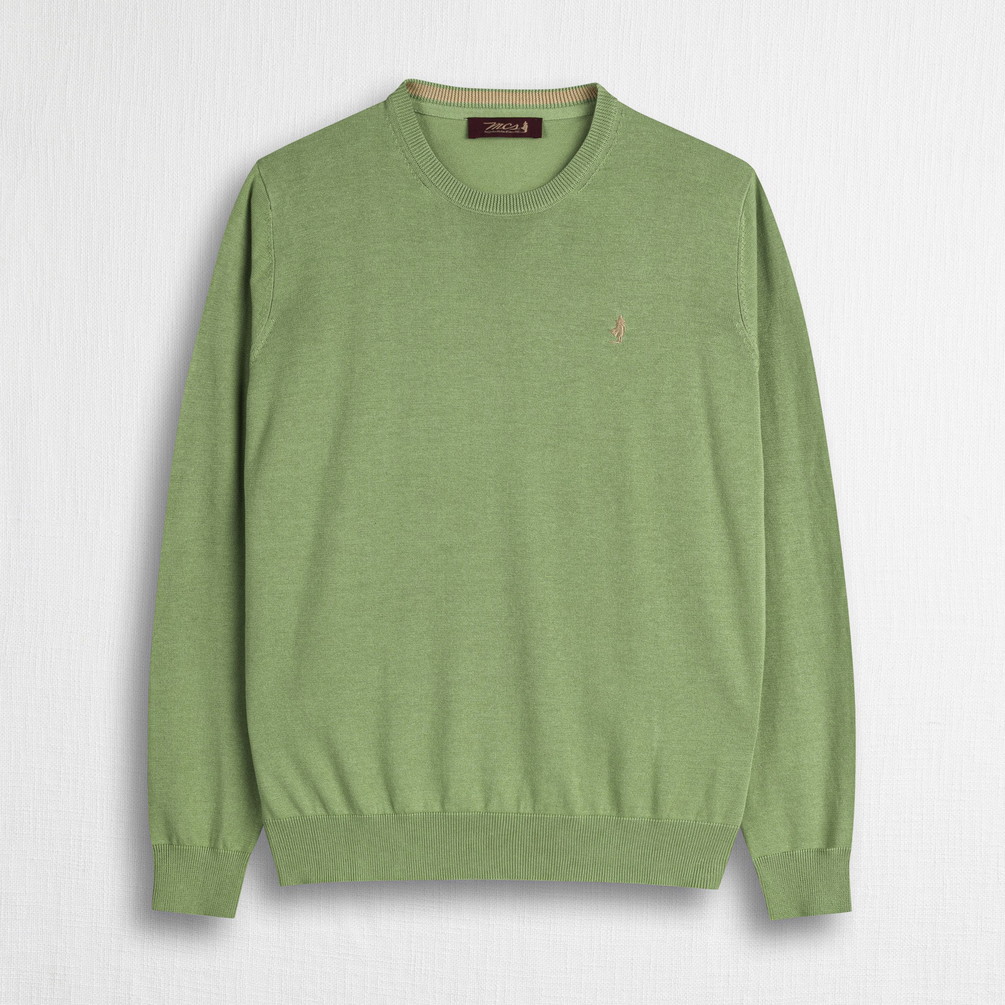 Men's crew neck sweater in solid Light Green, made of 100% lightweight cotton with a 12-gauge knit, the perfect balance between lightness and comfort for transitional seasons. The yarn-dyed process ensures rich, long-lasting colors and a defined texture, while the enzyme wash gives a soft, natural feel. Essential yet distinctive, this men's cotton crew neck sweater is completed with the refined Rider MCS embroidery on the chest and a contrasting color inside the collar for a detail that makes a difference.