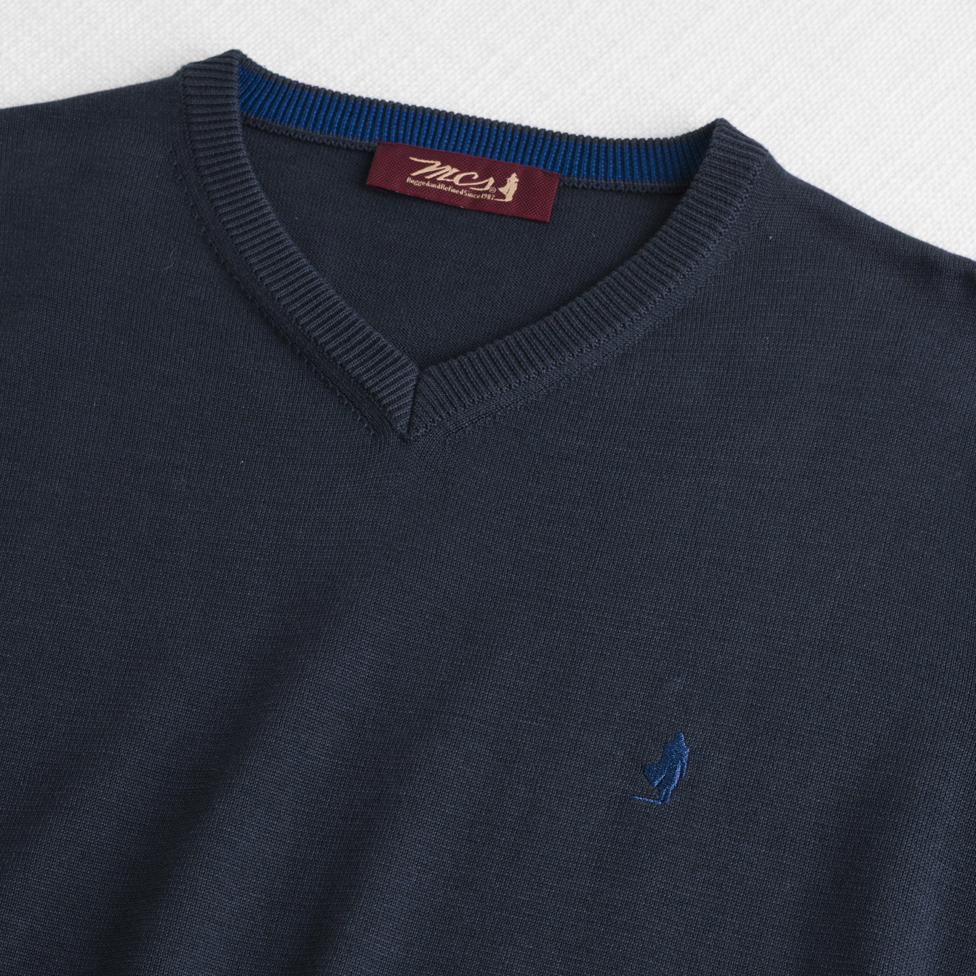 Men's Navy Blue V-neck sweater made of 100% cotton with a 12-gauge knit, ideal as a lightweight men's sweater for versatile everyday use. The solid color design with a V-neck creates a clean and casual look, perfect even worn over a shirt. The yarn-dyed cotton fabric ensures lasting color and a refined texture, enhanced by enzyme washing that highlights the softness of the yarn, while the Rider MCS embroidery signs this pullover with an authentic character. The Regular fit guarantees comfort and freedom of movement.