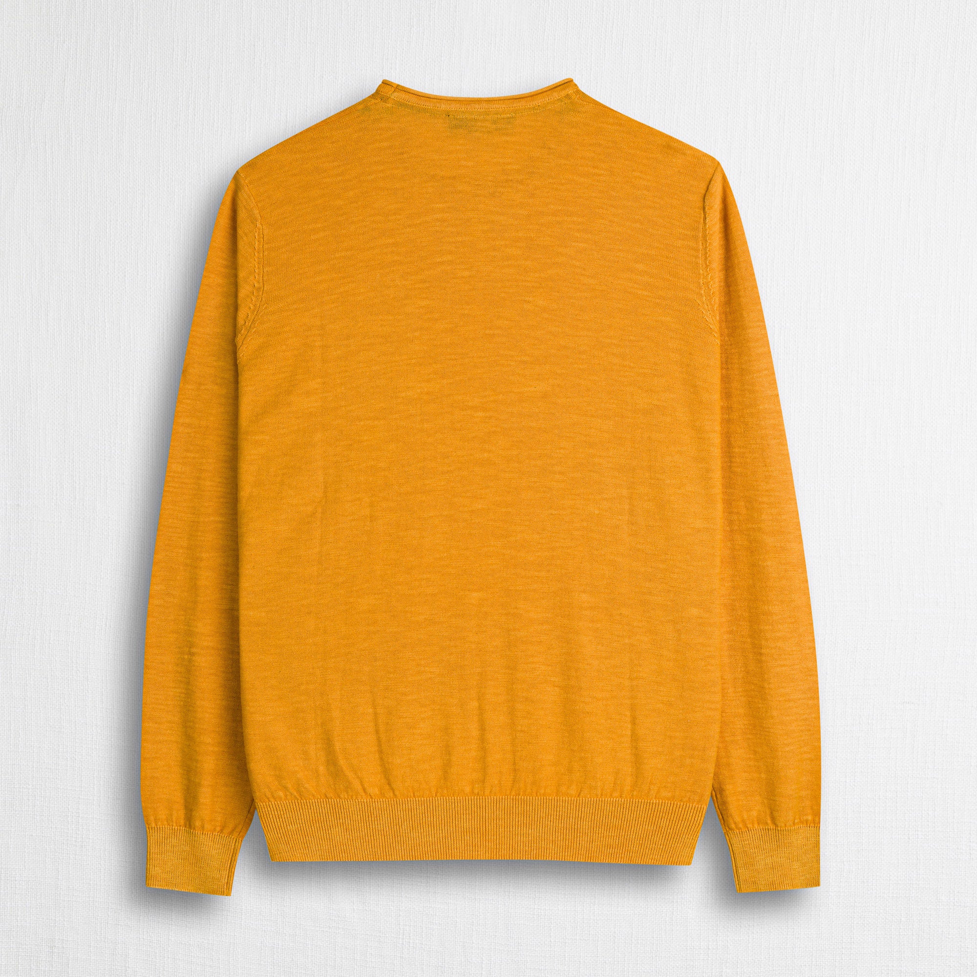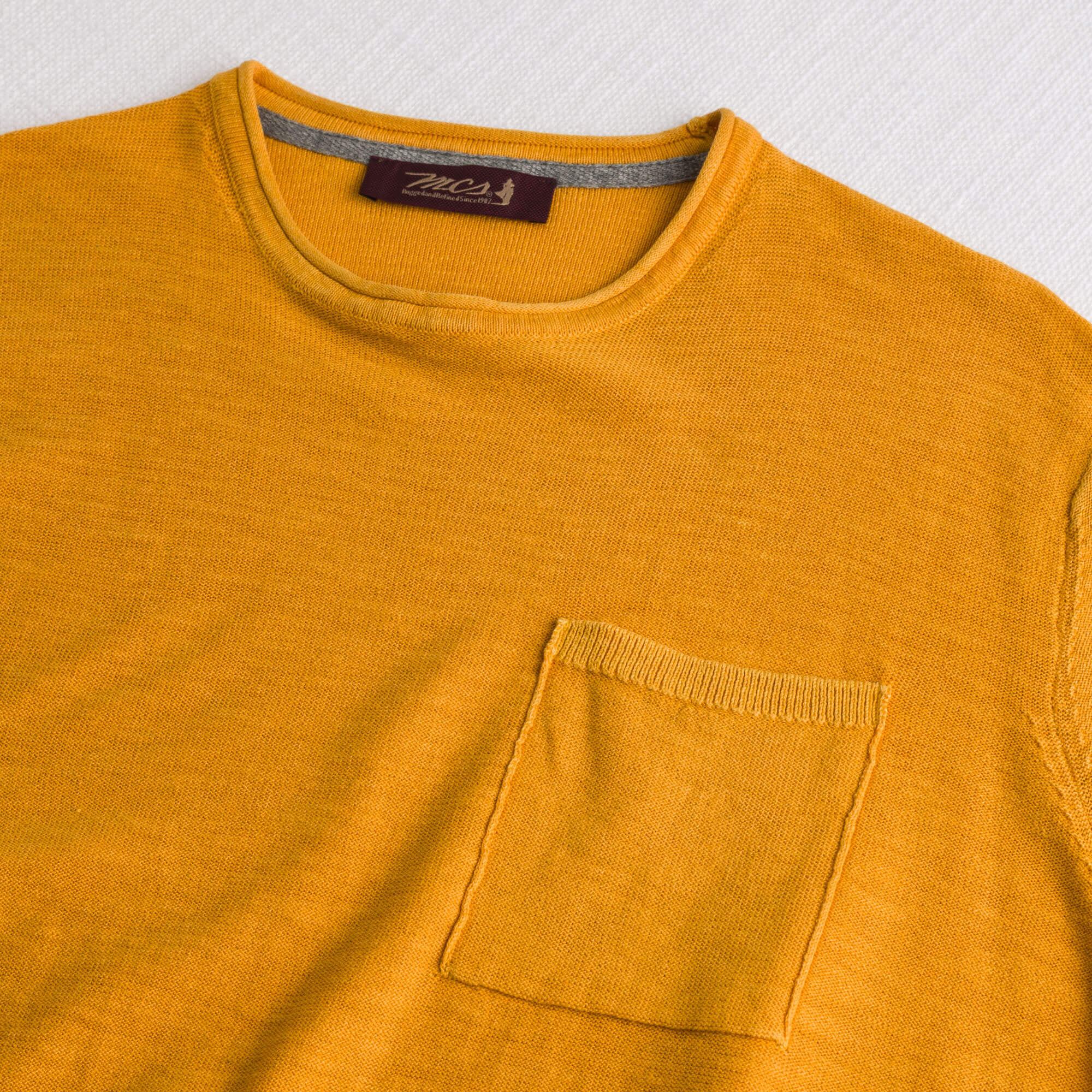 Men's crew neck sweater in Gold Yellow made of 100% fine flame cotton, thickness 12, designed for natural comfort and a textured feel with authentic character. The Acid Wash treatment gives a slightly worn effect and unique shading, enhancing the depth of the color of this crew neck sweater, ideal for mid-season wear. The solid color design is enriched by the chest pocket detail and the tone-on-tone Rider MCS embroidery on the lower left side of the sweater. The regular fit ensures comfort and versatility for a look suitable for any occasion.