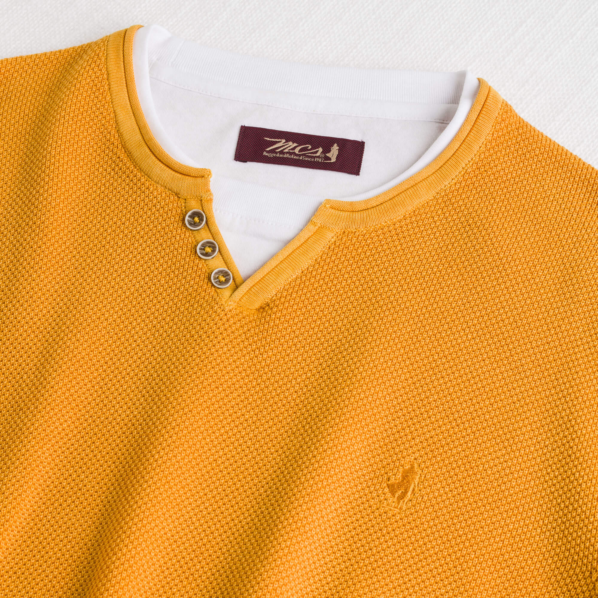 Men's long-sleeve Gold Yellow shirt with a henley collar made of 100% piquet cotton, featuring a raised texture that gives the garment a refined look while promoting breathability. The henley design with buttons on the collar is enhanced by a contrasting faux T-shirt detail at the neckline, adding an interesting layered effect with a contemporary touch. The Acid Wash treatment gives a slightly worn effect, enriching the solid color of the shirt with unique shades, while the embroidered Rider MCS logo signs this relaxed piece, ideal for spring and summer looks. The regular fit ensures comfort and versatility.