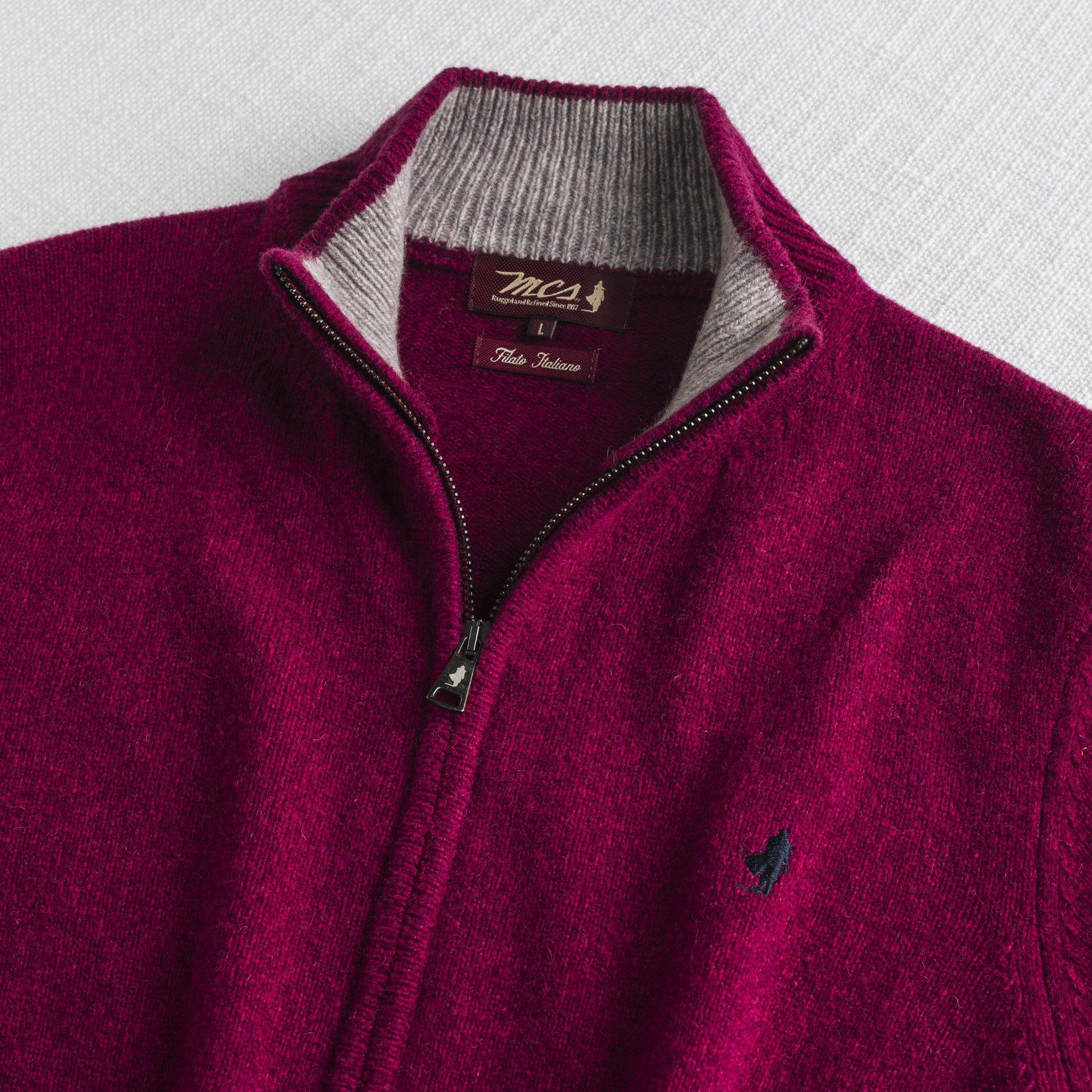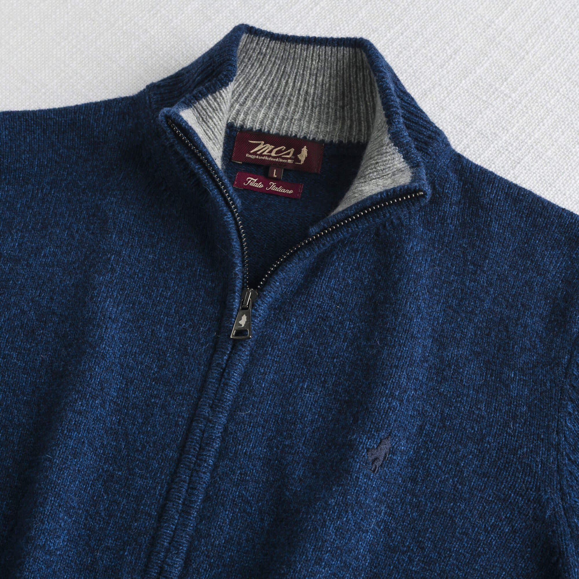 Maglia full zip uomo in lambswool mouliné finezza 7. L’intreccio dei filati crea un effetto cromatico profondo e distintivo, che valorizza la texture morbida e resistente. Con dettagli come il contrasto interno al collo e il ricamo Rider sul punto cuore, questo modello con zip frontale integrale offre versatilità e calore in ogni occasione.