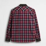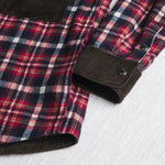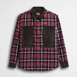 Overshirt in soft flannel dyed in checkered patterns in shades of red, featuring utility-style corduroy pockets applied on the chest. Side pockets inserted in the seam for a functional touch, cuffs, collar, and internal details finished in corduroy. Front closure and cuffs with custom snap buttons featuring the MCS logo, for a detail that adds authenticity to the garment.