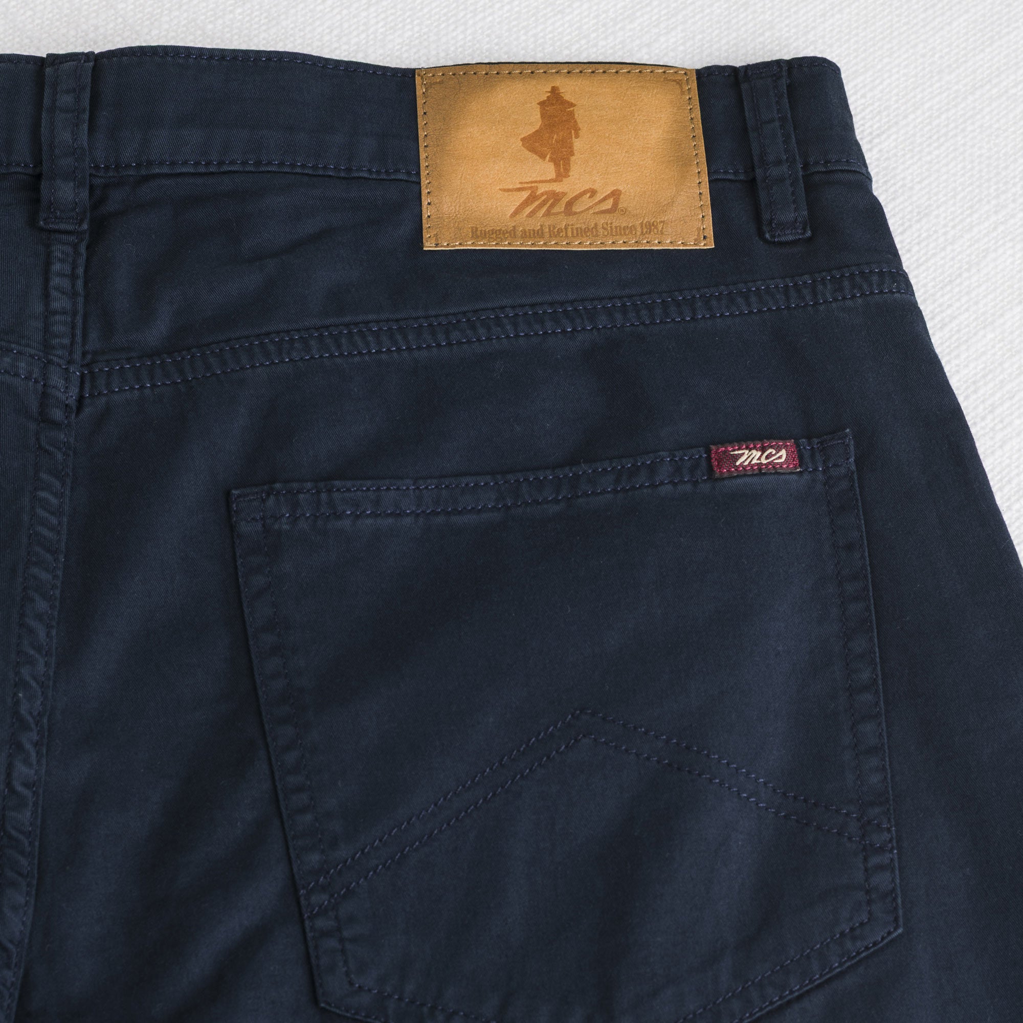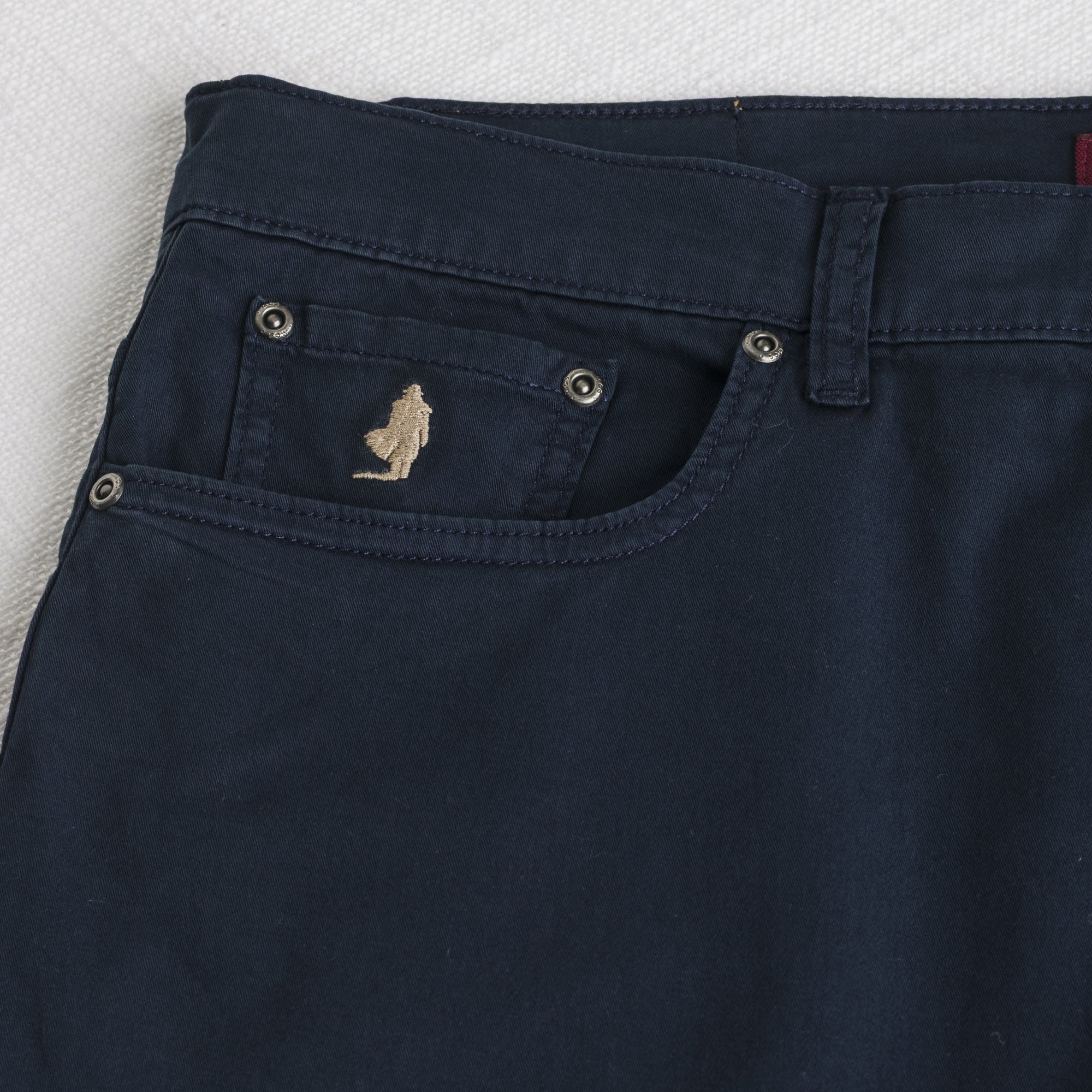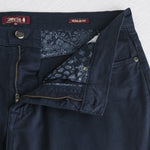 Summer casual pants model with 5 pockets in Navy Blue stretch gabardine, garment-dyed, breathable, and wear-resistant. The gabardine fabric texture is enhanced by dusty vintage-effect colors achieved through pigment dyeing. The design is completed by distinctive details such as the Rider MCS embroidery on the small pocket, jacron patch, and gunmetal-colored metal hardware. The regular fit model ensures comfort and freedom of movement, ideal for contemporary, refined, and versatile men's casual spring-summer looks.