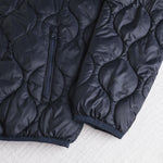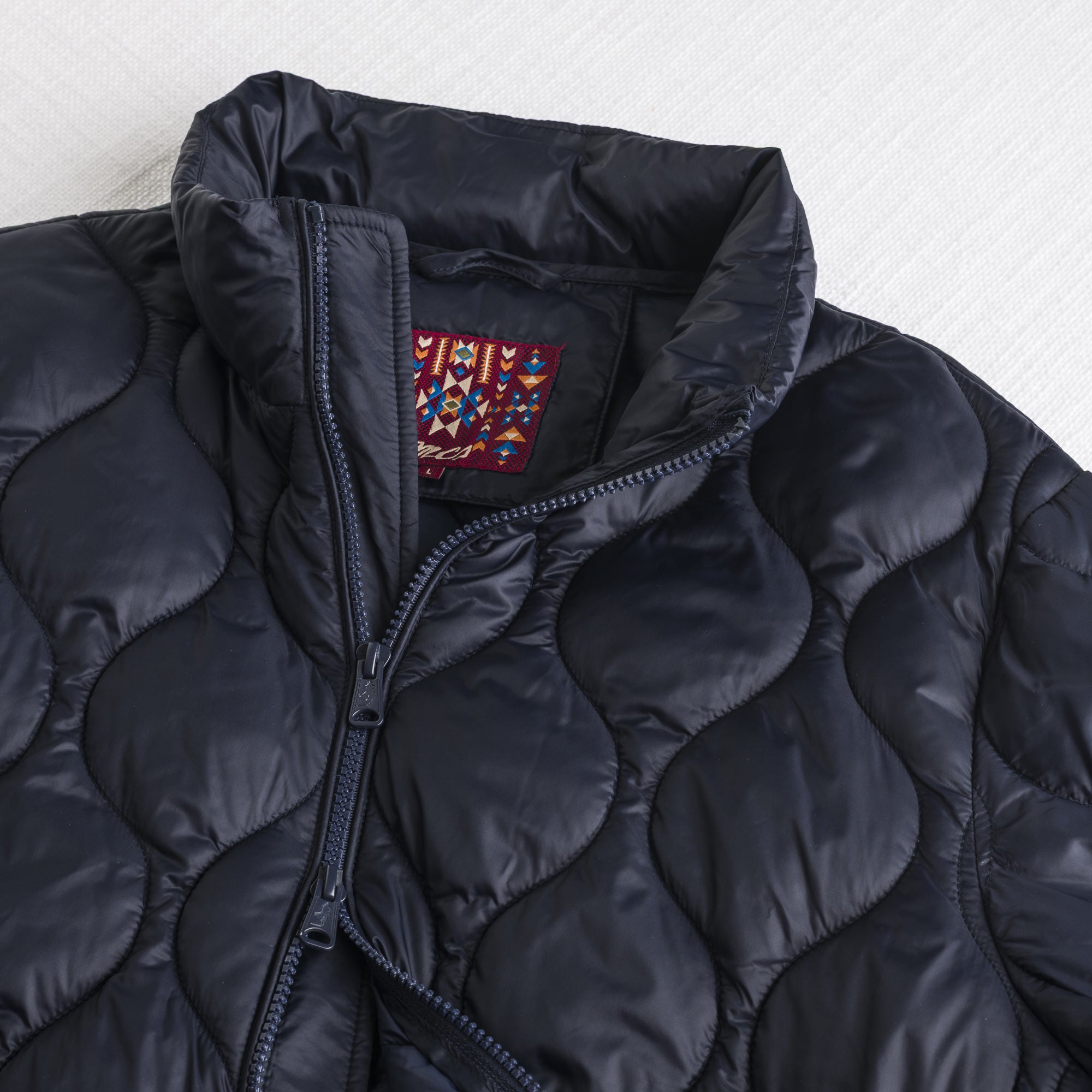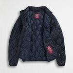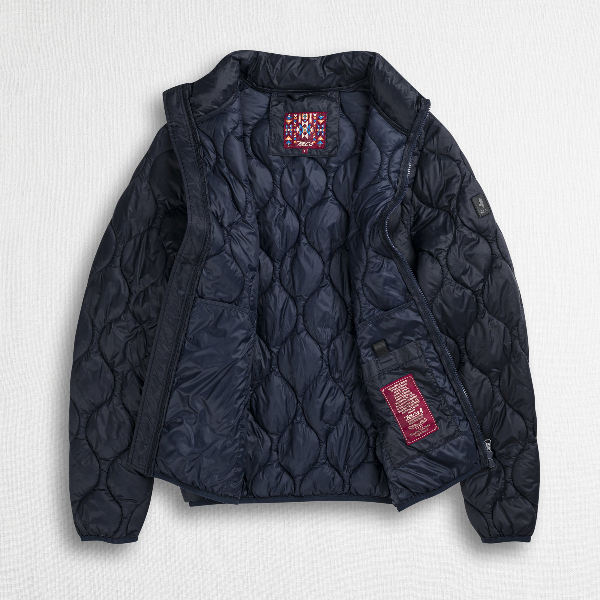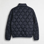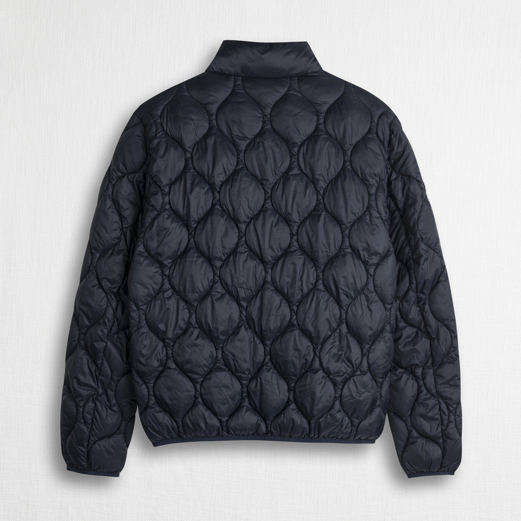 Lightweight Navy Blue men's down jacket in nylon with water-repellent treatment and Sorona® filling, ideal as a mid-season down jacket. The quilted onion pattern defines the contemporary design aesthetic, while the regular fit ensures everyday comfort. A lightweight, versatile, and distinctive spring-summer down jacket, thanks to the silicone patch on the sleeve that adds authenticity to the look.