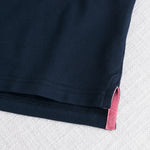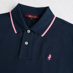 Short-sleeve Navy Blue polo shirt in stretch cotton piqué, designed to offer adaptable comfort. The classic design is enhanced by a ribbed collar and cuffs with a contrasting stripe, a distinctive detail that gives this solid-color polo a sporty yet elegant look. Logoed pearl buttons, side slits, and a slightly longer back hem complete the model. The Rider MCS embroidery over the heart signs the garment with a recognizable and timeless touch.