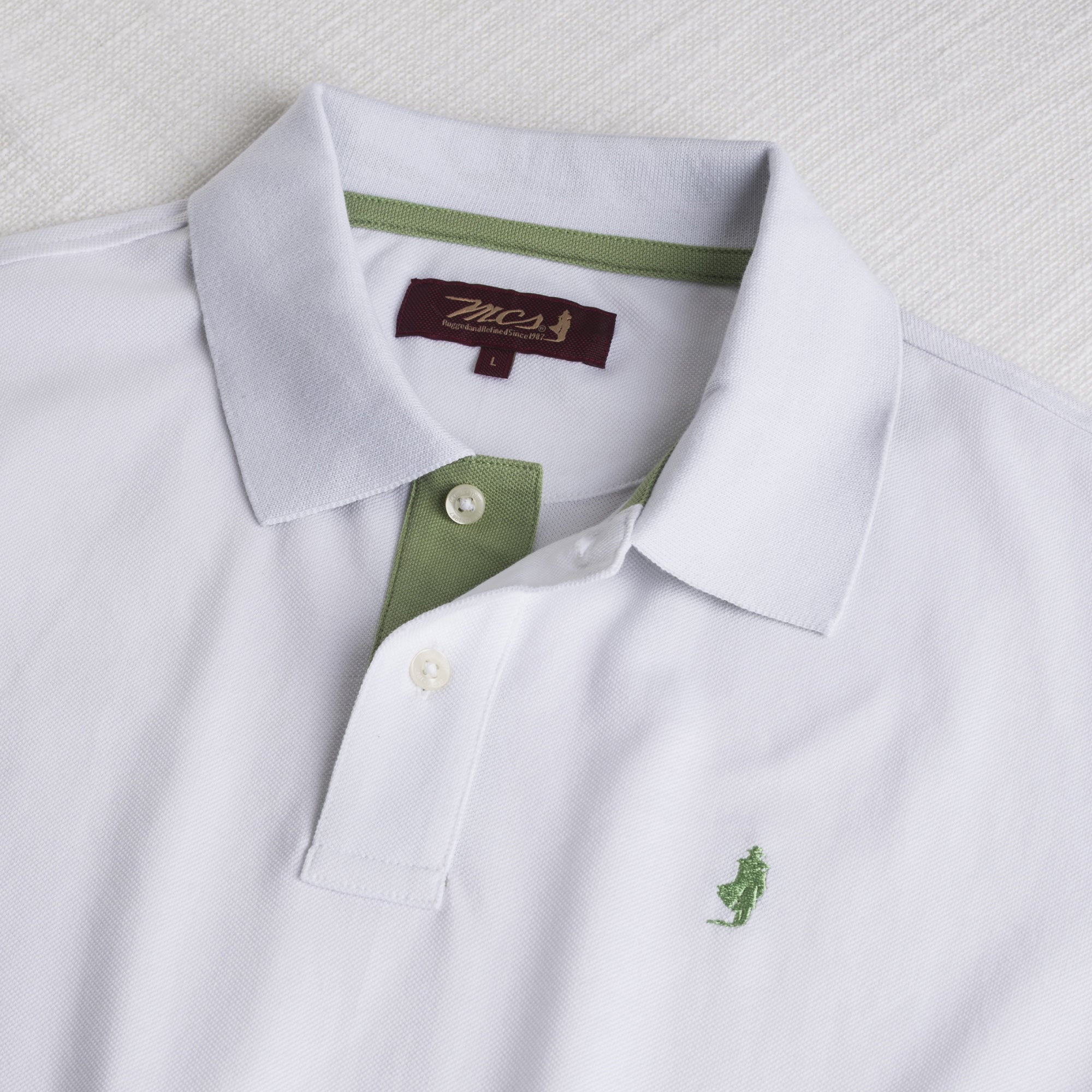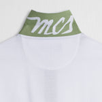 Short-sleeve polo shirt in white stretch cotton piqué, soft and lightweight, perfect for a refined casual look. The two-tone jacquard collar is enhanced with the MCS logo on the reverse for a subtle style detail. Logo-embossed pearl buttons and the Rider MCS embroidery on the chest complete the design with a touch of authenticity and attention to detail. Side slits ensure an optimal fit and freedom of movement, while the regular fit guarantees a comfortable and always stylish look, suitable for any occasion.