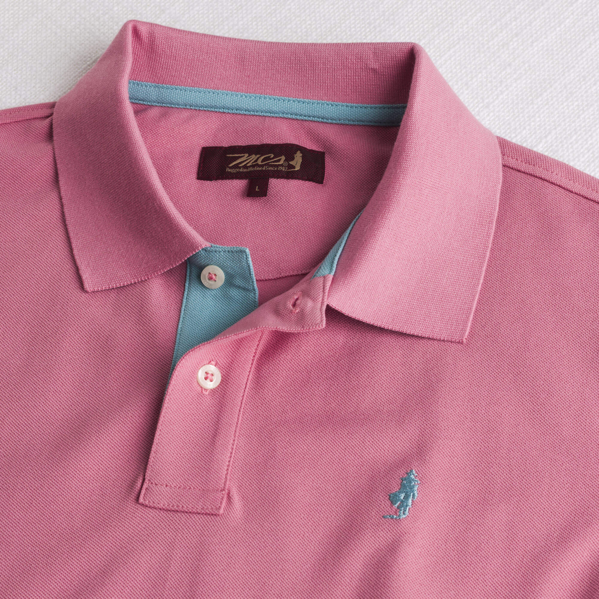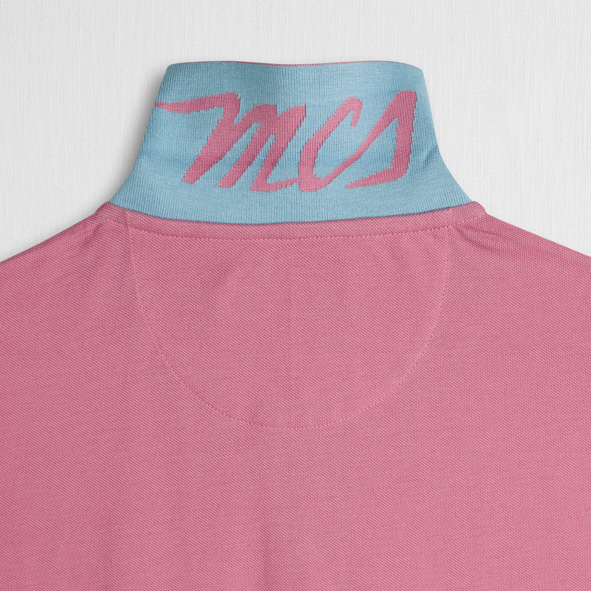 Short-sleeve polo shirt in Wild Rose stretch cotton piqué, soft and lightweight, perfect for a refined casual look. The two-tone jacquard collar is enhanced by the MCS logo on the reverse for a subtle style detail. Logo-embossed pearl buttons and the Rider MCS embroidery on the chest add a touch of authenticity and attention to detail. Side slits ensure an optimal fit and freedom of movement, while the Regular fit guarantees a comfortable and always stylish look, suitable for any occasion.