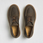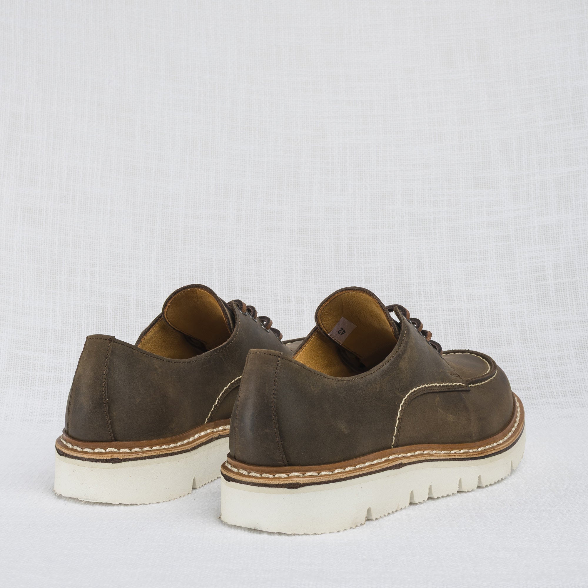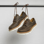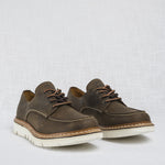 Men's lace-up shoe in water-repellent oiled nubuck leather with an aged effect, handcrafted in Italy, combines durability, comfort, and style. The contrasting white sole adds a contemporary touch, while the hot-stamped brand on the tongue and inside expresses authenticity and attention to detail. Perfect for those looking for a versatile shoe that can complete casual and smart casual looks with personality.