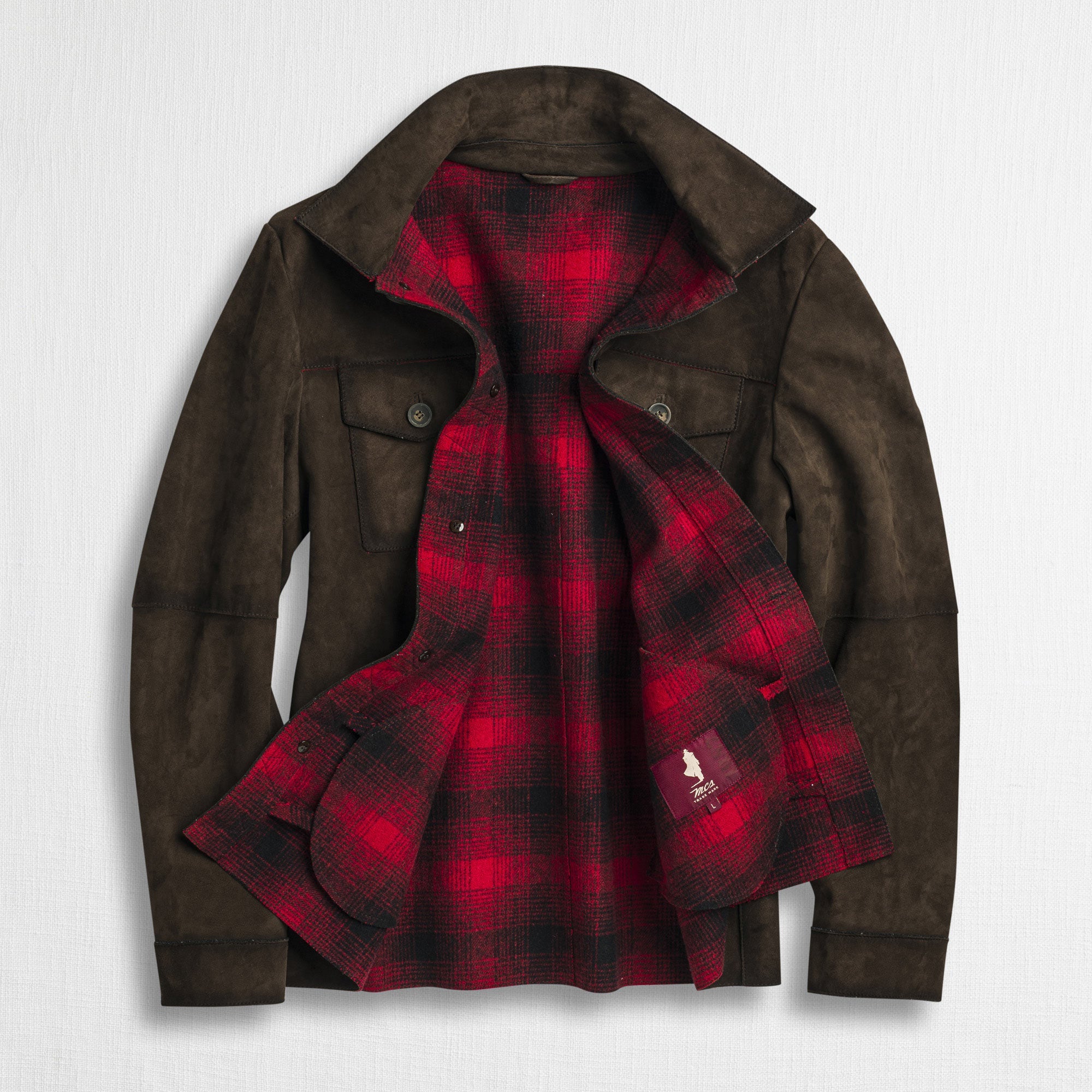 Men's jacket in suede goat leather, with a woolen checkered fabric lining for a warm and comfortable look. Equipped with patch pockets on the chest, welt pockets on the sides, and a contrasting woolen fabric undercollar. The horn-effect buttons complete the bold design that combines functionality and style.