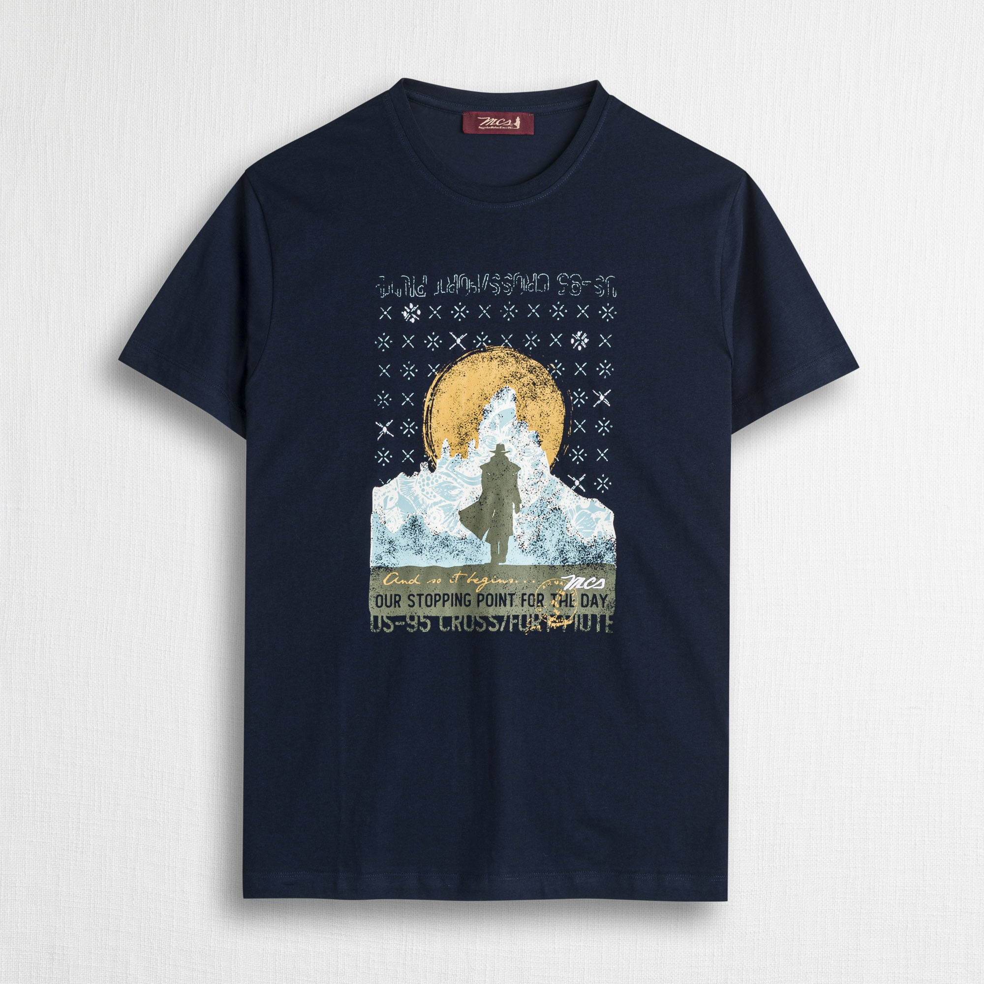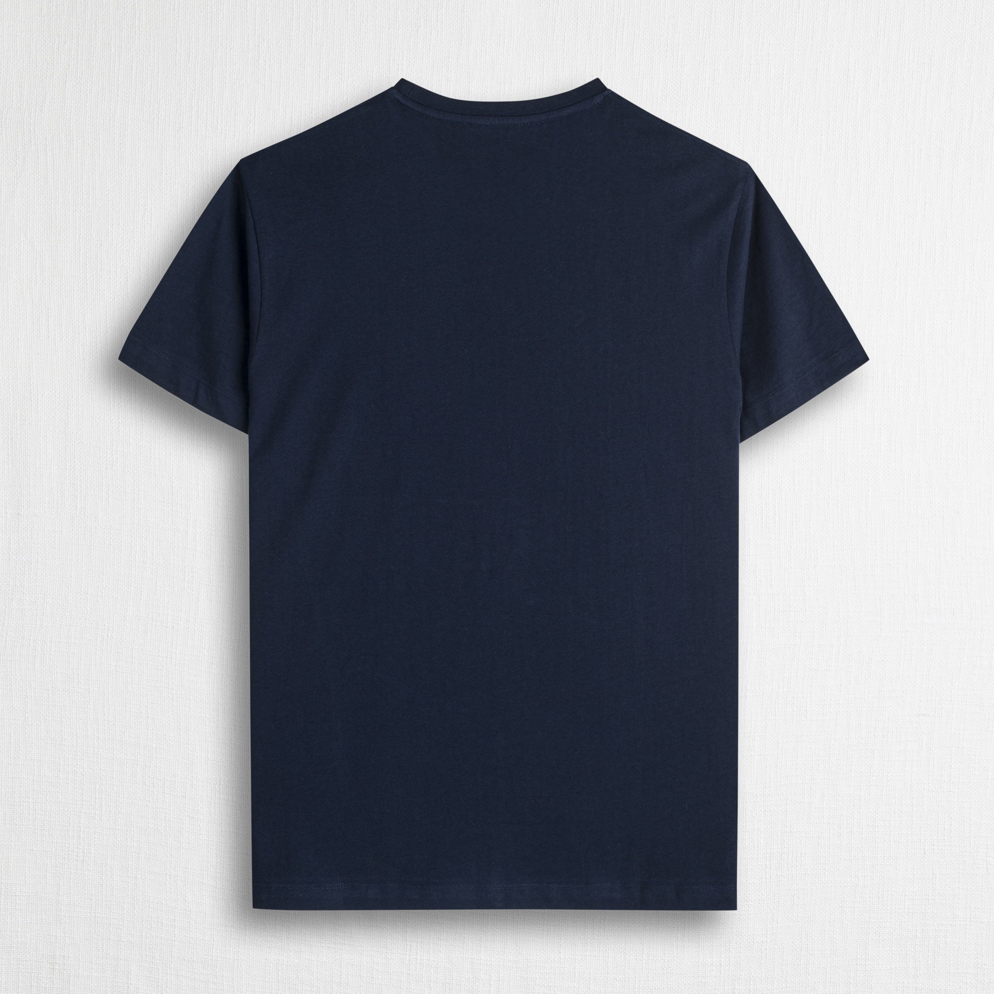 Men's Navy Blue T-shirt with print, made of 100% piece-dyed cotton, designed for a casual and distinctive look. The solid color base highlights the front artwork, which adds character without sacrificing simplicity. The soft jersey fabric and regular fit ensure comfort and freedom of movement. An essential yet never ordinary shirt, perfect for expressing a relaxed and contemporary style.