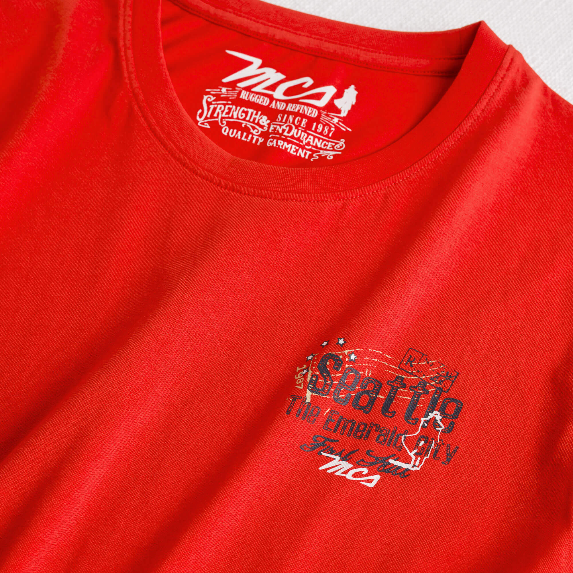 Men's Spice Orange T-shirt with print, made of 100% cotton with Strike Wash treatment, which gives the fabric a slightly worn effect and unique shades. The print over the heart area sits on a simple base, creating a balance between authenticity and character. The regular fit and soft jersey ensure everyday comfort. A casual T-shirt with a distinctive and timeless style.