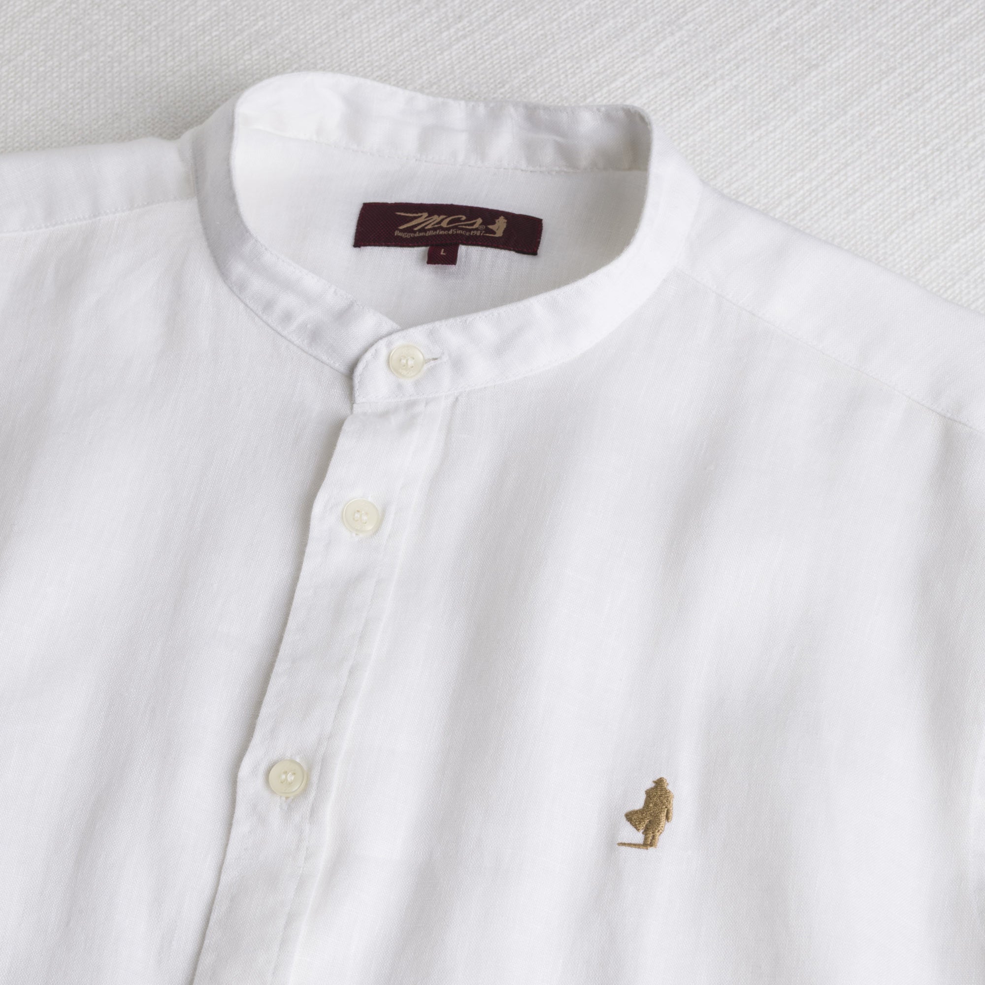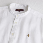Camicia di lino uomo in puro lino tinto in pezza White, leggera e traspirante, ideale per affrontare la stagione calda con comfort. Il design si distingue per la linea pulita e disinvolta e per il colletto alla coreana che aggiunge un tocco raffinato al design casual, per un look essenziale ma mai banale. La vestibilità regular accompagna i movimenti con naturalezza e garantisce un comfort ottimale. Rifinito con bottoni perlati e ricamo Rider simbolo MCS sul petto per un tocco di autenticità al look.