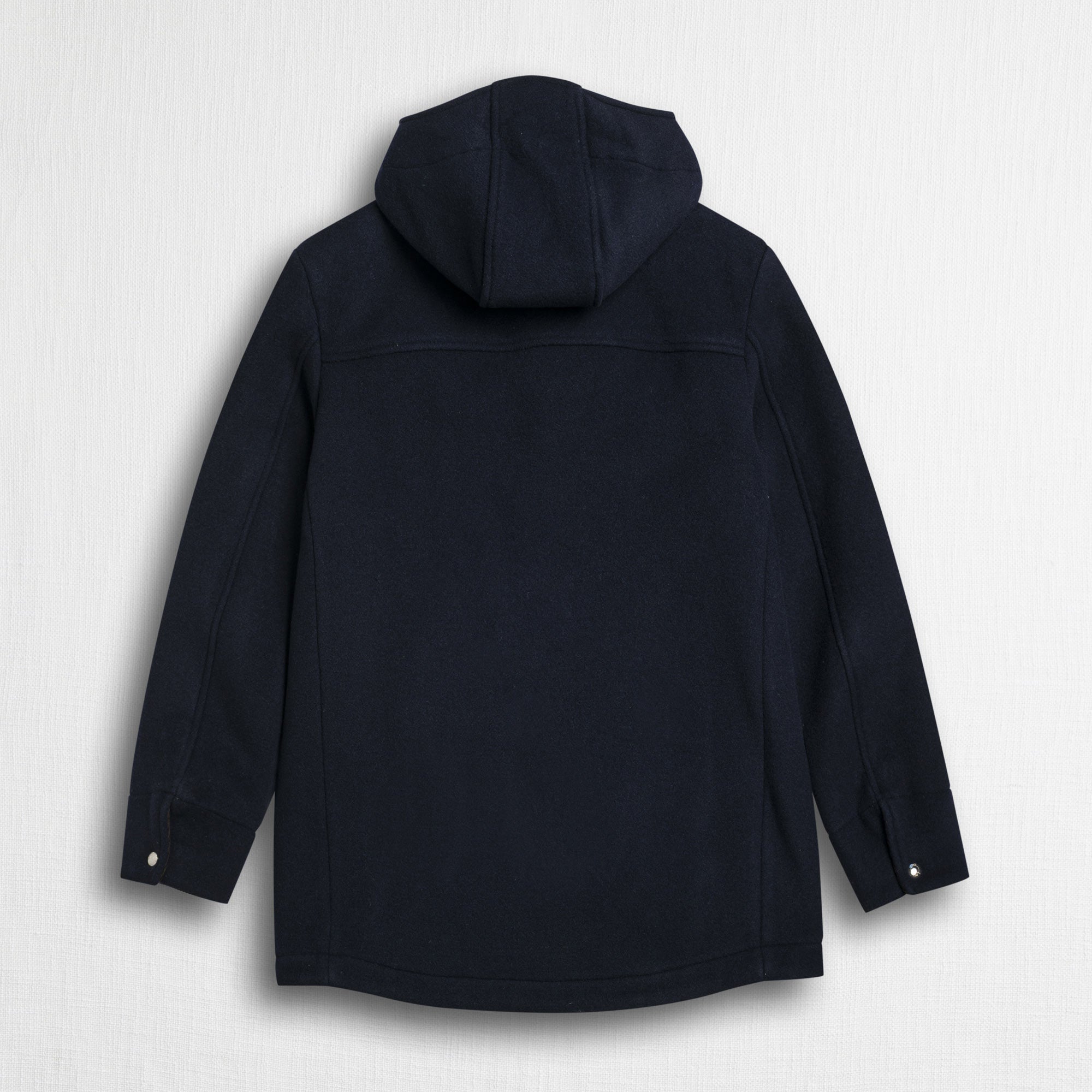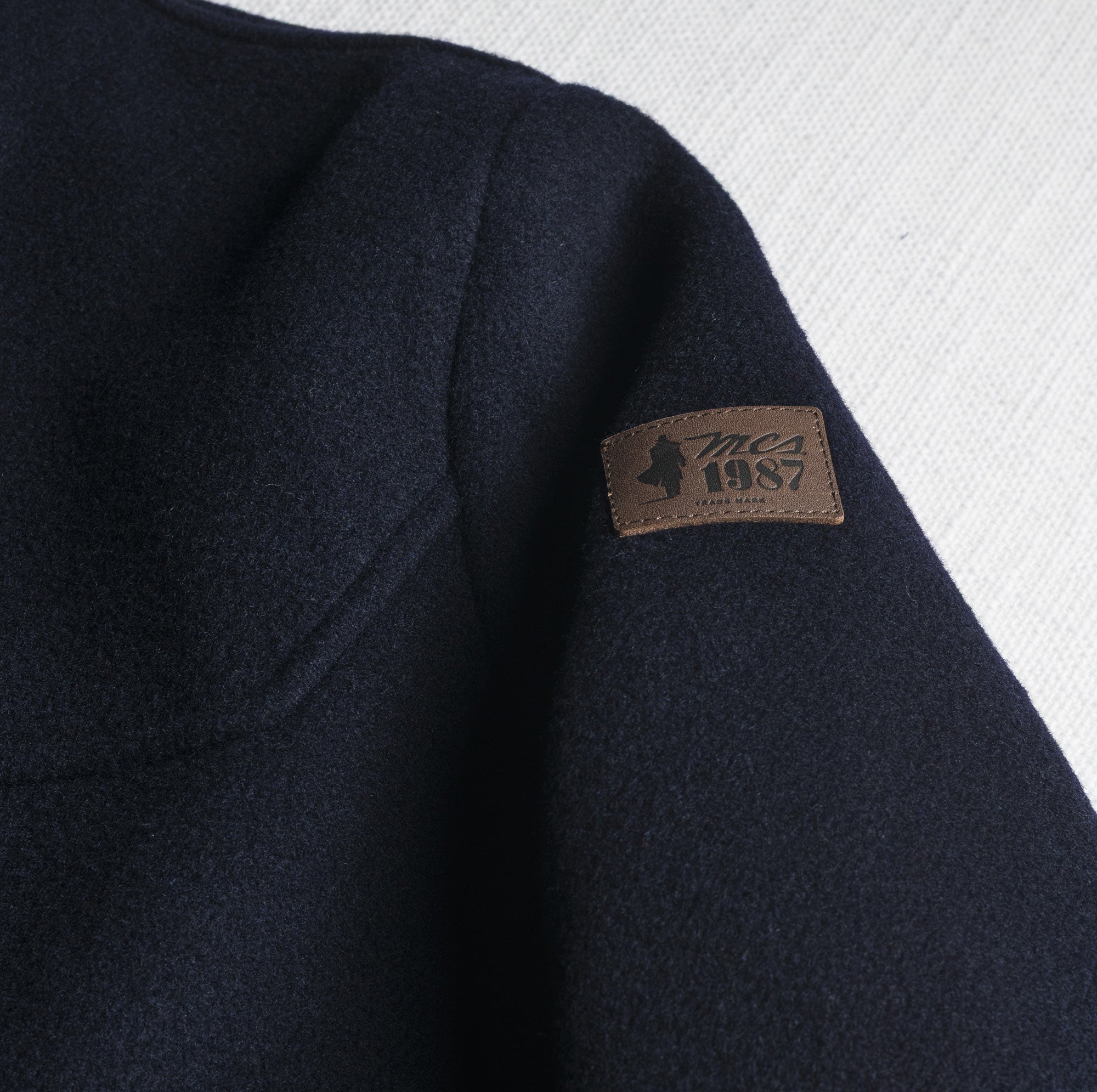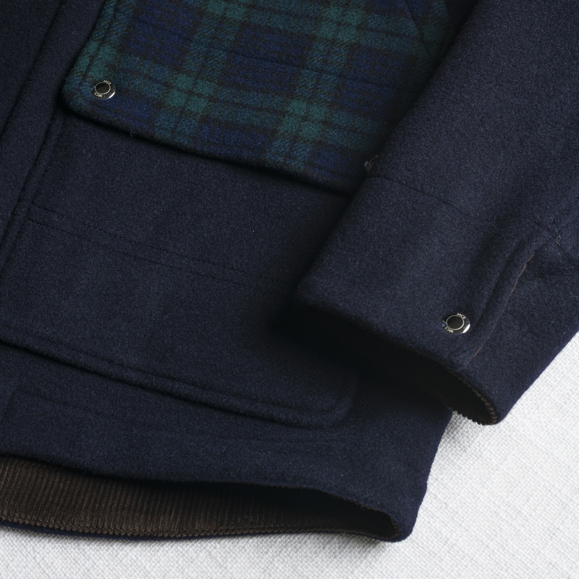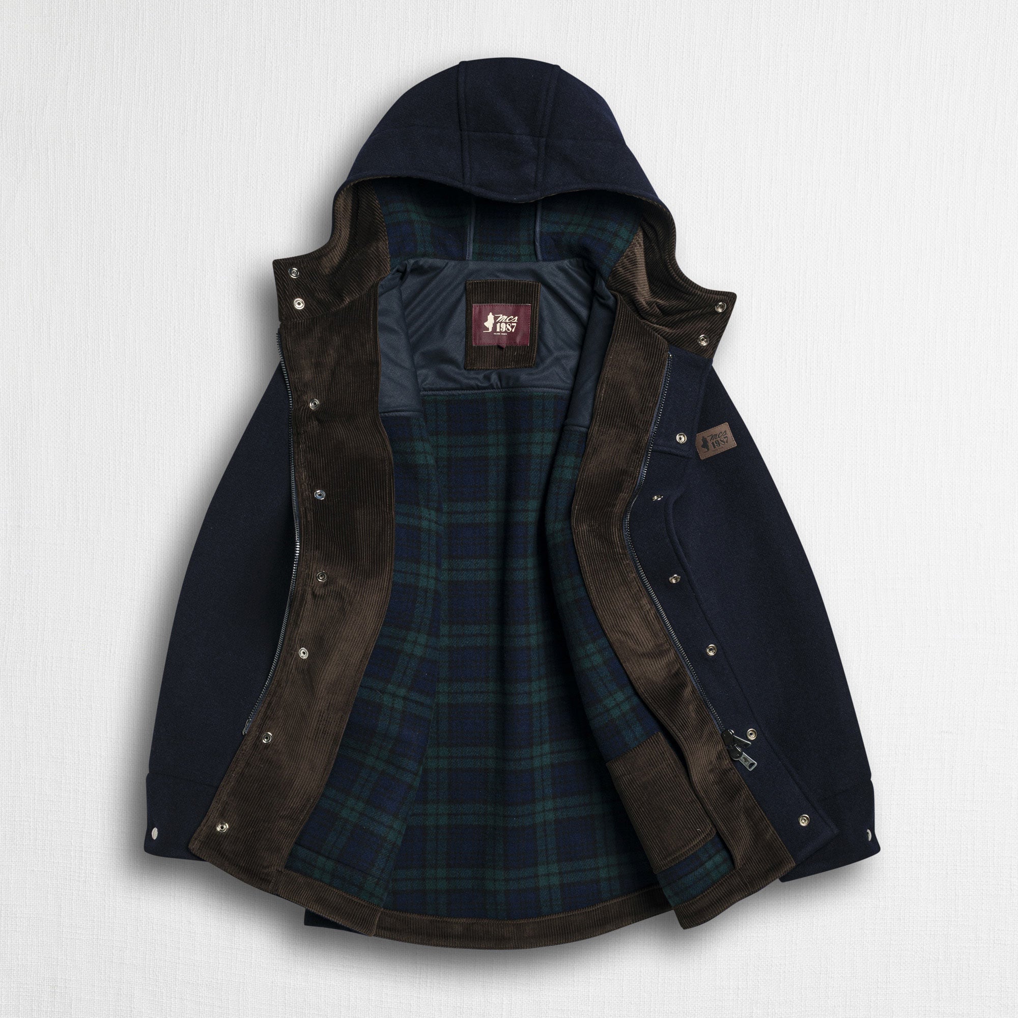 Giacca caban in panno di pura lana a doppia tessitura con esterno in tinta unita ed interno in motivo check Black Watch, ripreso anche sulle tasche utility ispirate ai capi d’archivio del brand. Struttura compatta e calda, senza necessità di fodera grazie alla costruzione double. Paramontura, fondo e cappuccio rifiniti in velluto a coste per un contrasto materico che aggiunge interesse. Chiusura frontale con zip e bottoni a pressione nascosti per un look pulito e funzionale. Etichetta in pelle applicata sulla manica sinistra. Un capo iconico interamente Made in Italy che unisce eleganza e funzionalità.