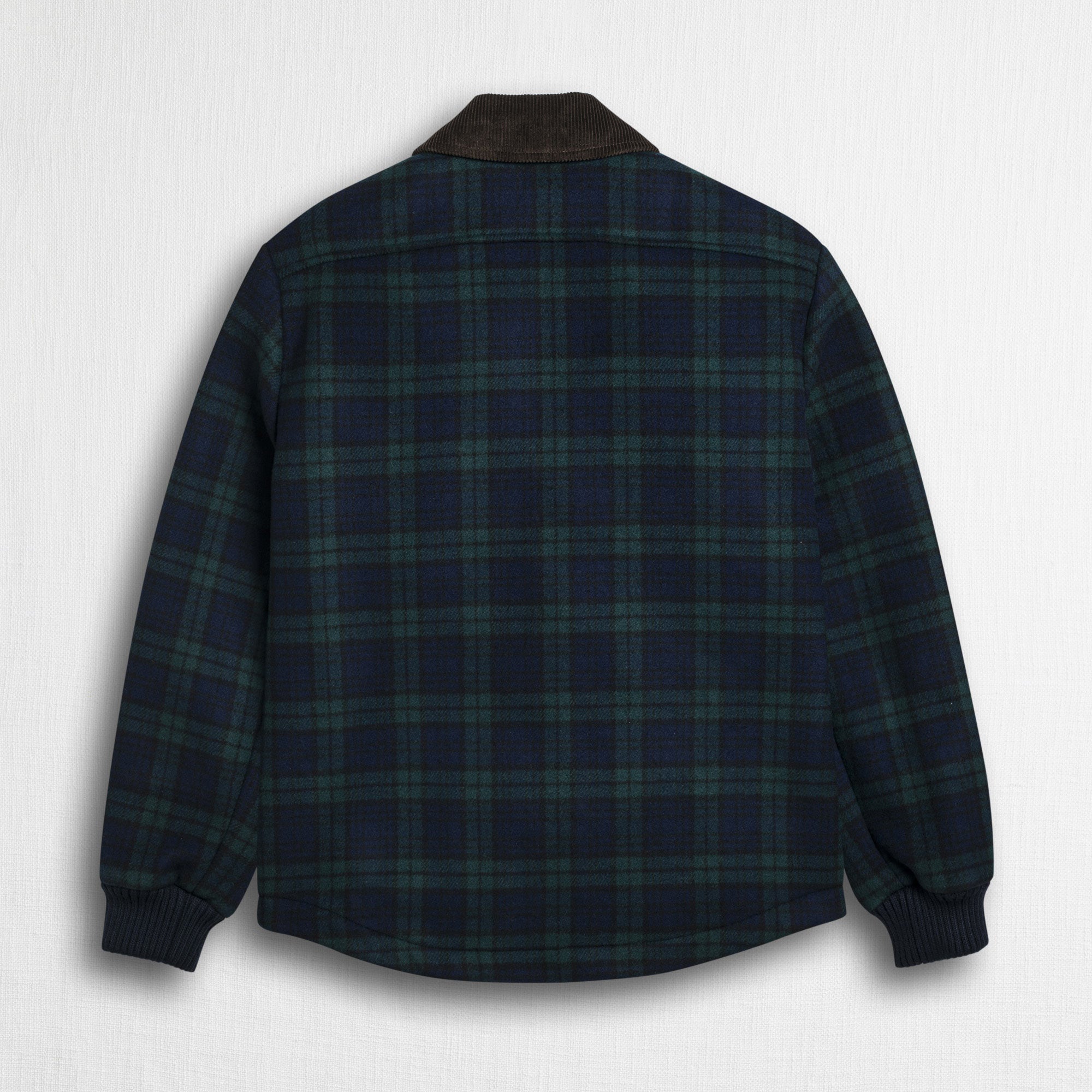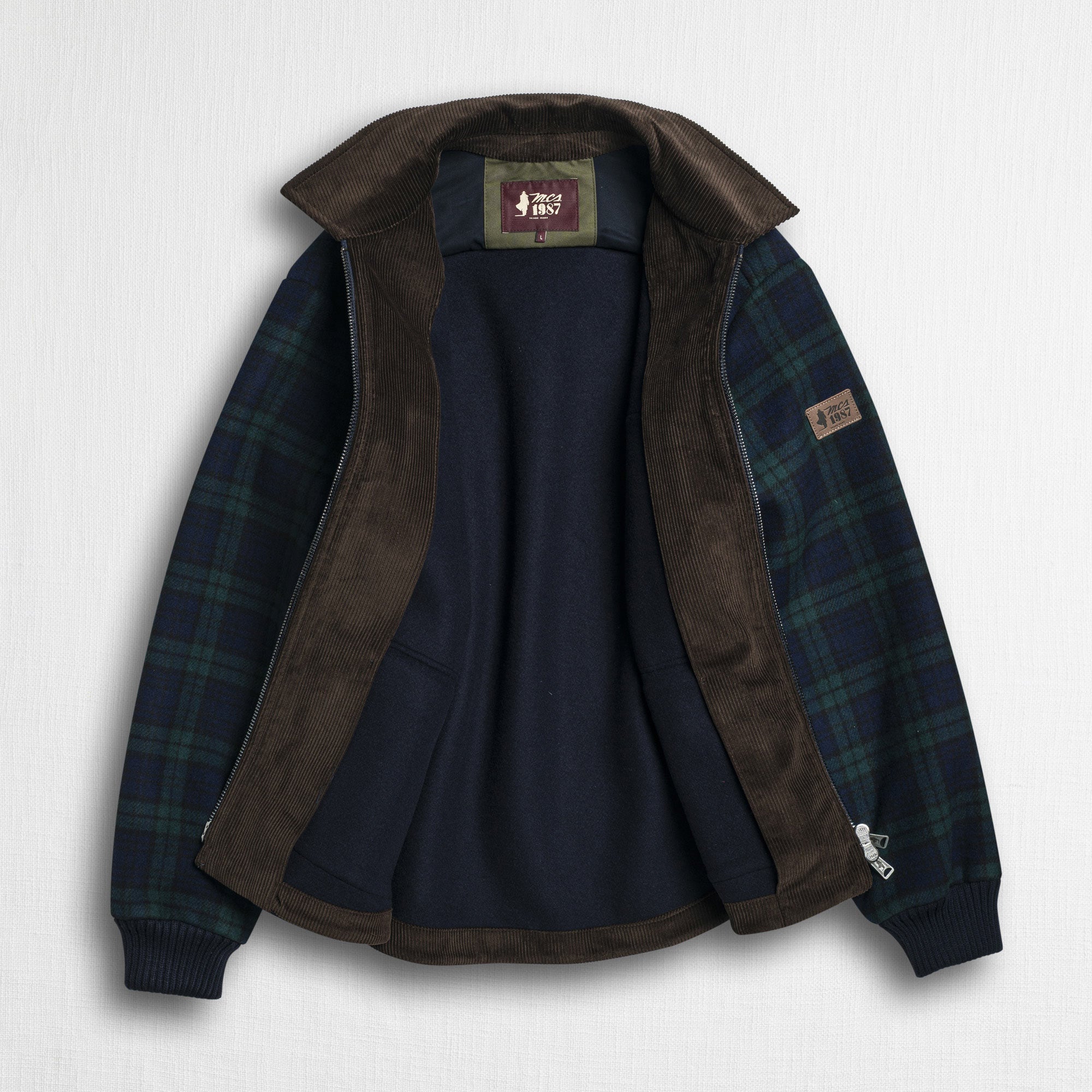 Giacca Harrington con chiusura a zip, realizzata in panno di pura lana doppio di tessitura: esterno con motivo check Black Watch e interno in tessuto tinta unita. Collo, profili interni e tasche utility ispirati agli iconici capi d’archivio del brand, con finitura in velluto 800 righe e pattina superiore delle tasche in tessuto cerato British Millerain, idrorepellente e altamente resistente all’usura. Etichetta in pelle applicata sulla manica sinistra. Interamente Made in Italy.
