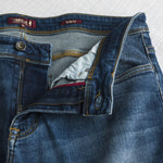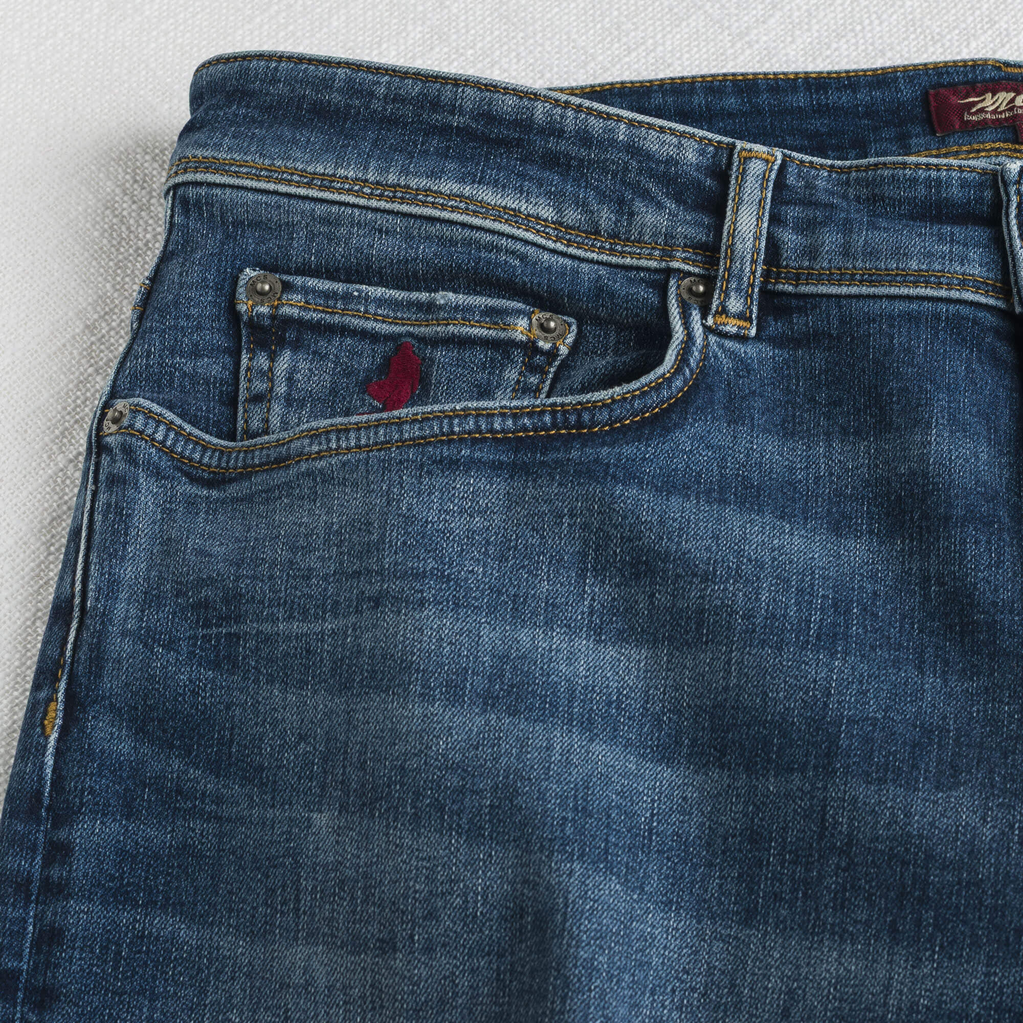 Jeans cinque tasche in blu denim stretch con lavaggio medio per un aspetto autentico e versatile. Cuciture tabacco, bottoni e rivetti logati in metallo rifiniscono il capo; il ricamo Rider sul taschino e la salpa in pelle sul retrocinta completano questo must-have MCS. La vestibilità slim fit esalta la silhouette mantenendo comfort e libertà di movimento.