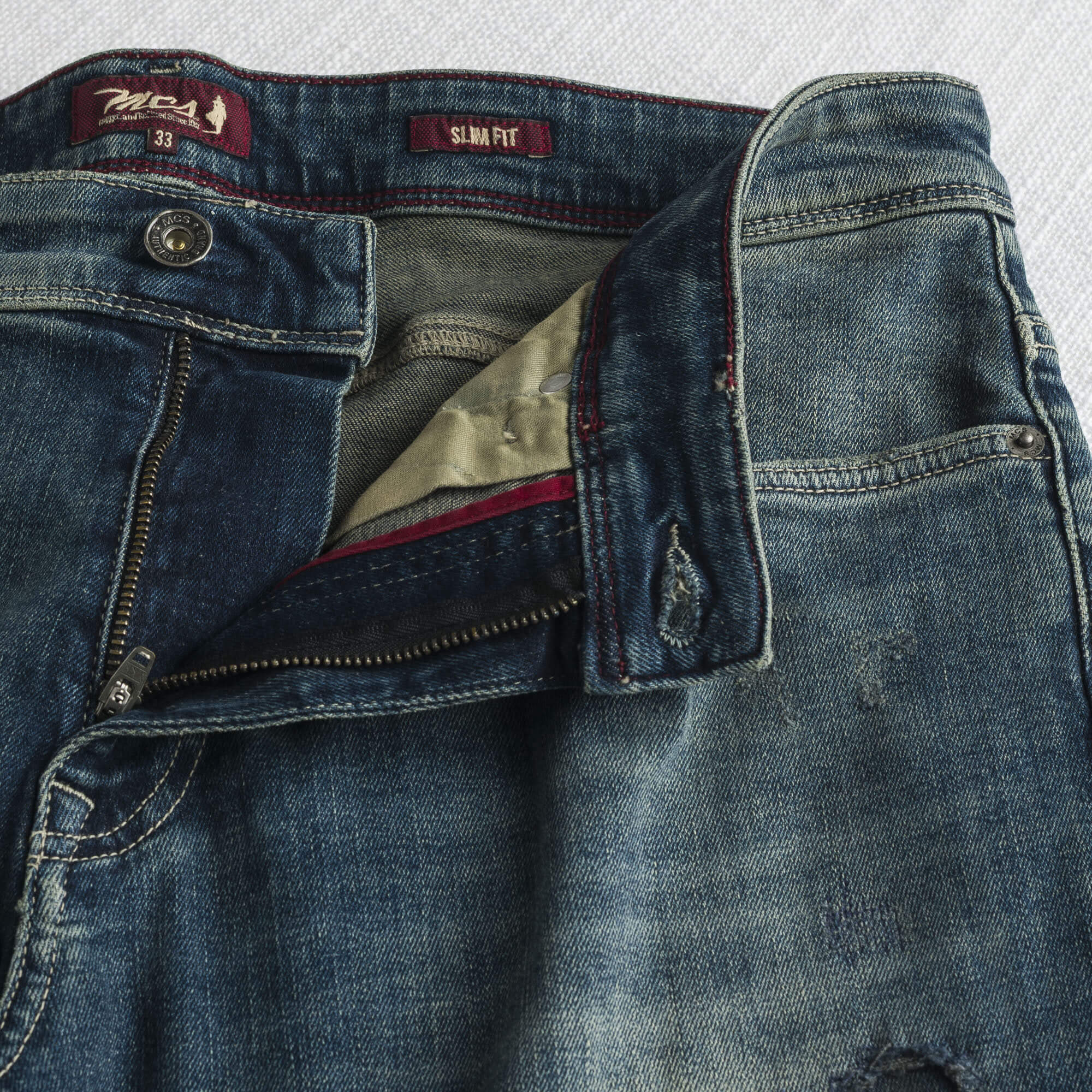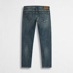 Cinque tasche in denim stretch con lavaggio medio/scuro e strappi che conferiscono un carattere deciso al look. Rifinito con dettagli iconici come cuciture tabacco, bottoni e rivetti logati in metallo, salpa in pelle sul retrocinta e ricamo Rider sul taschino. Vestibilità slim fit per un look contemporaneo dal carattere deciso.