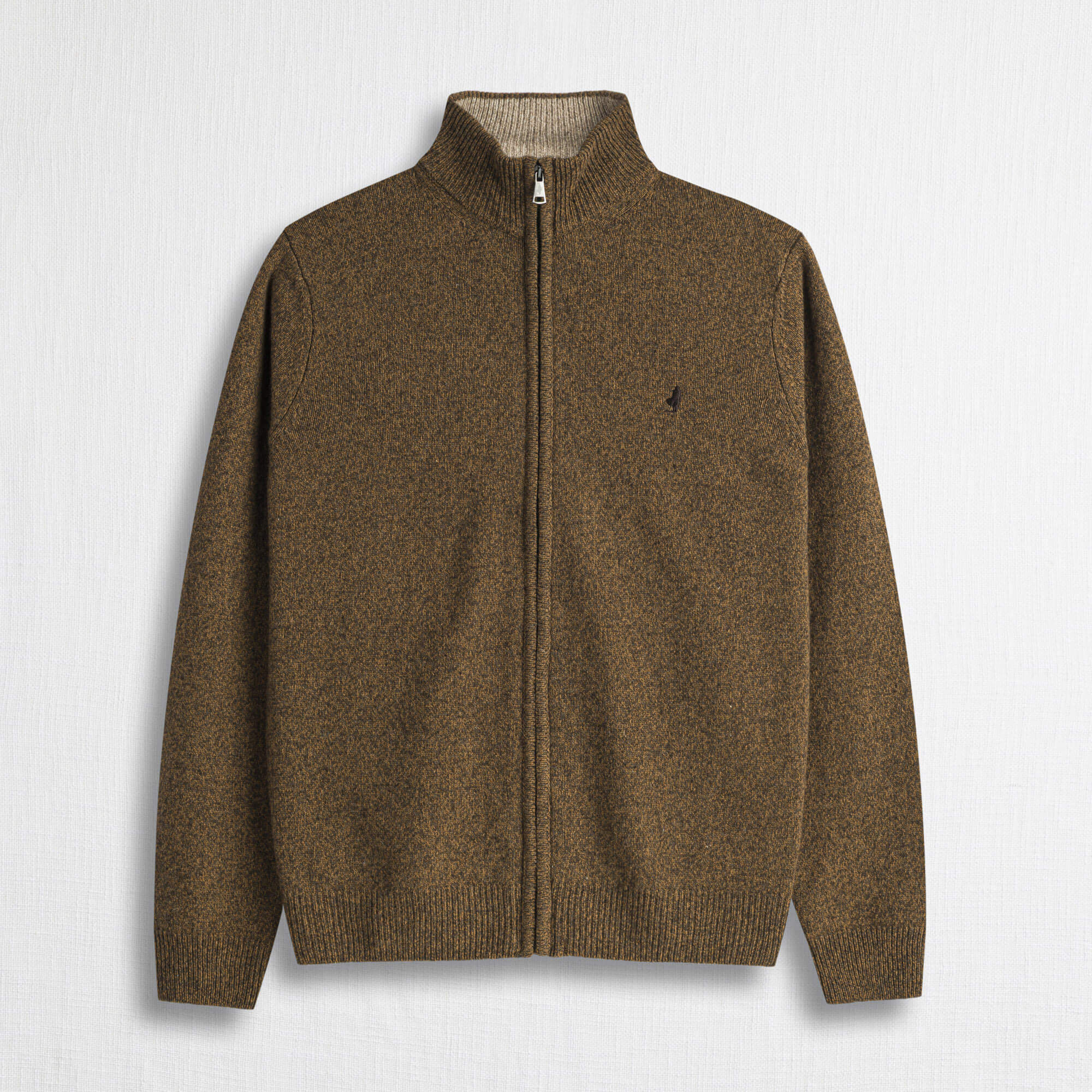 Maglia full zip uomo in lambswool mouliné finezza 7. L’intreccio dei filati crea un effetto cromatico profondo e distintivo, che valorizza la texture morbida e resistente. Con dettagli come il contrasto interno al collo e il ricamo Rider sul punto cuore, questo modello con zip frontale integrale offre versatilità e calore in ogni occasione.