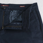 Pantalone chino estivo corto Navy Blue in gabardina stretch, ideale per un look casual e raffinato. La gabardina di cotone elasticizzata, con la sua caratteristica trama diagonale, assicura comfort e resistenza, mentre la tintura in capo dona al tessuto profondità cromatica e un aspetto autentico. Il ricamo Rider MCS sulla tasca destra completa il design firmando questo pratico e versatile bermuda da uomo.