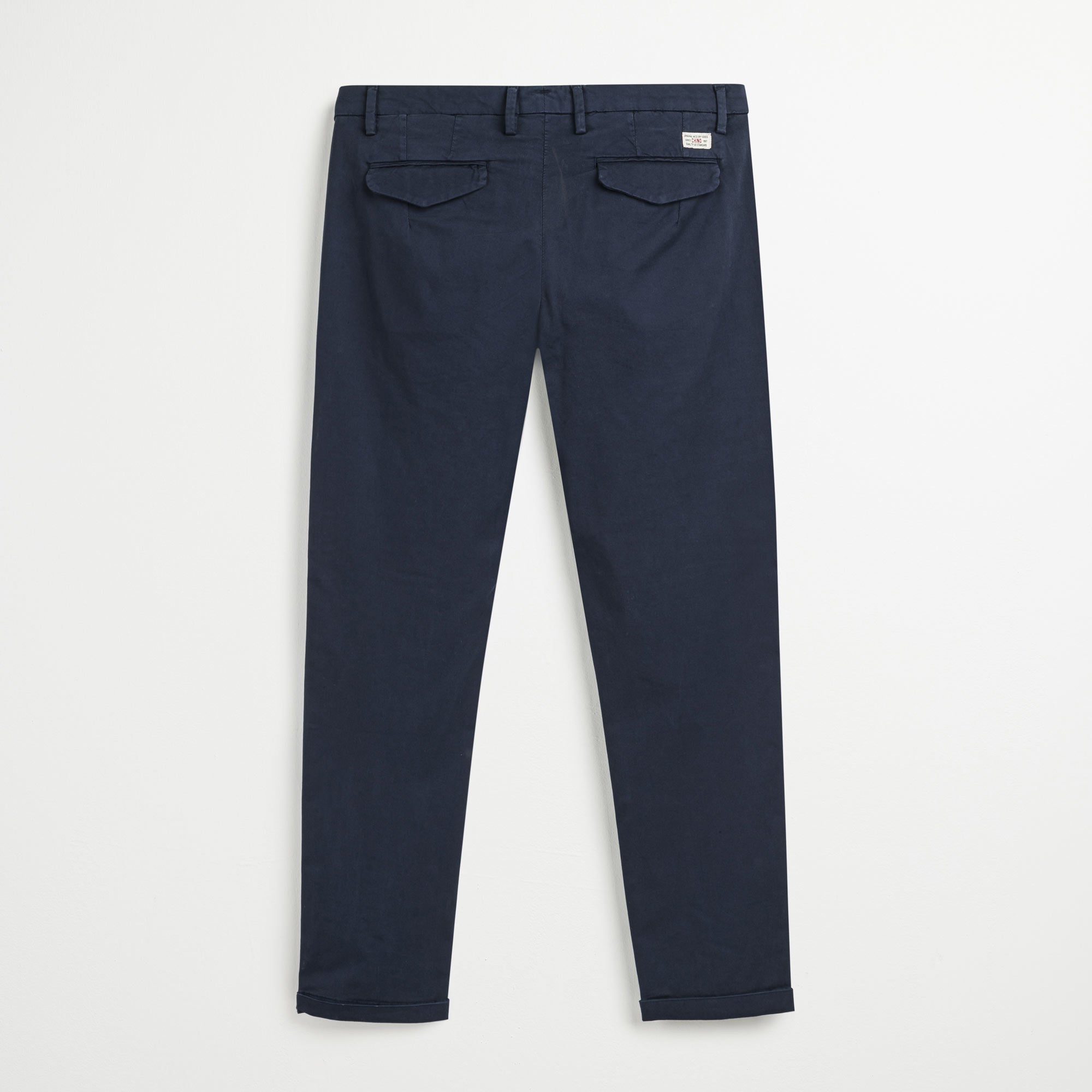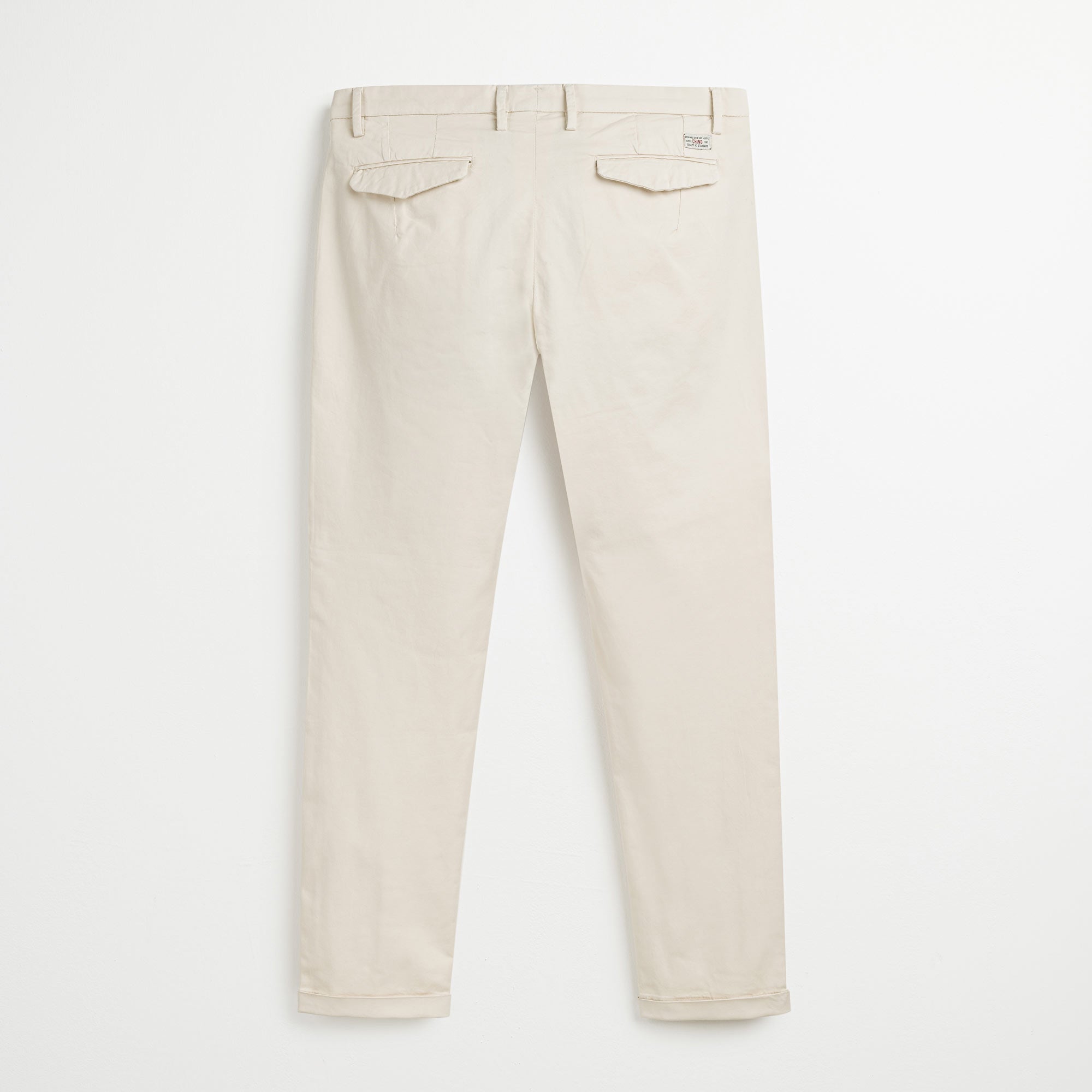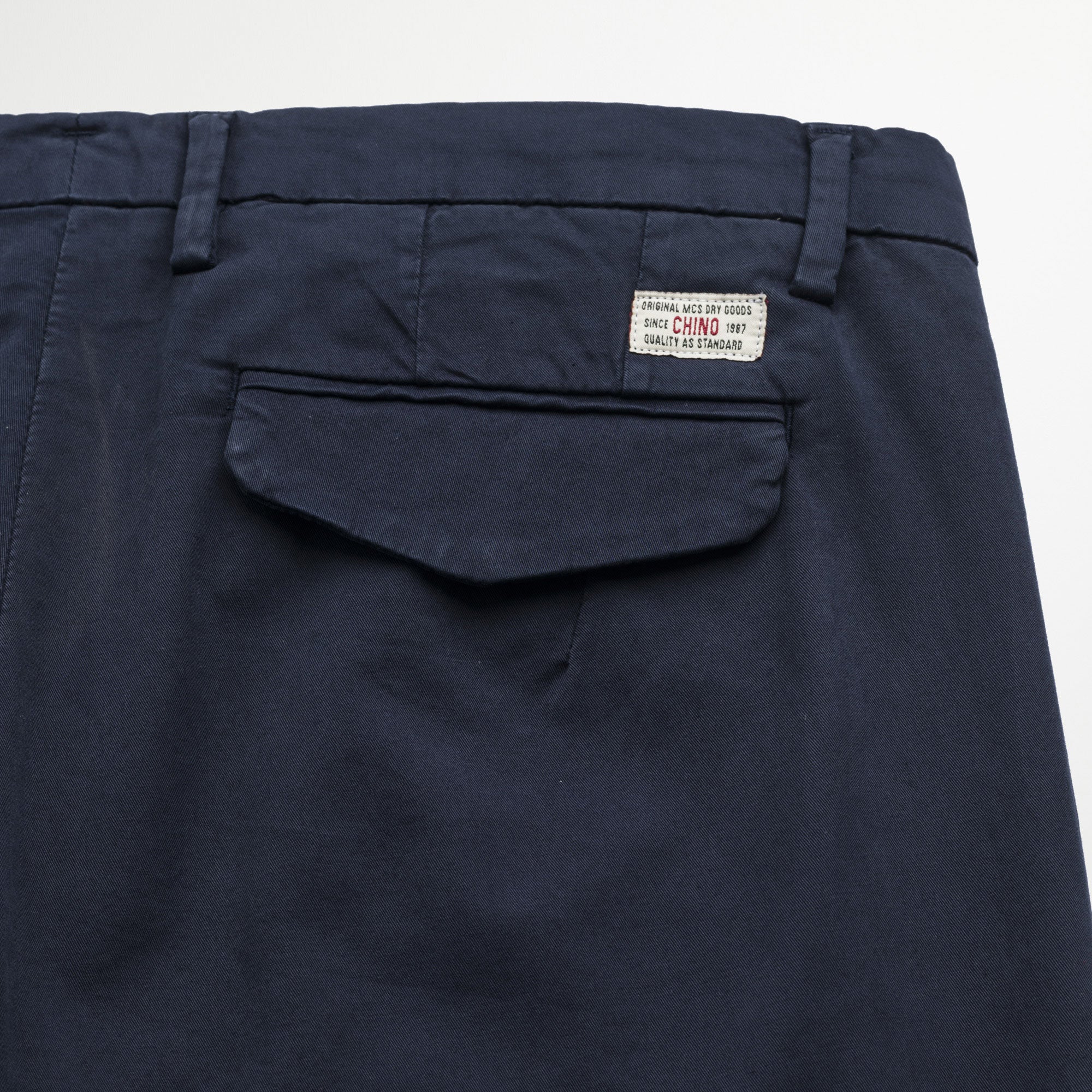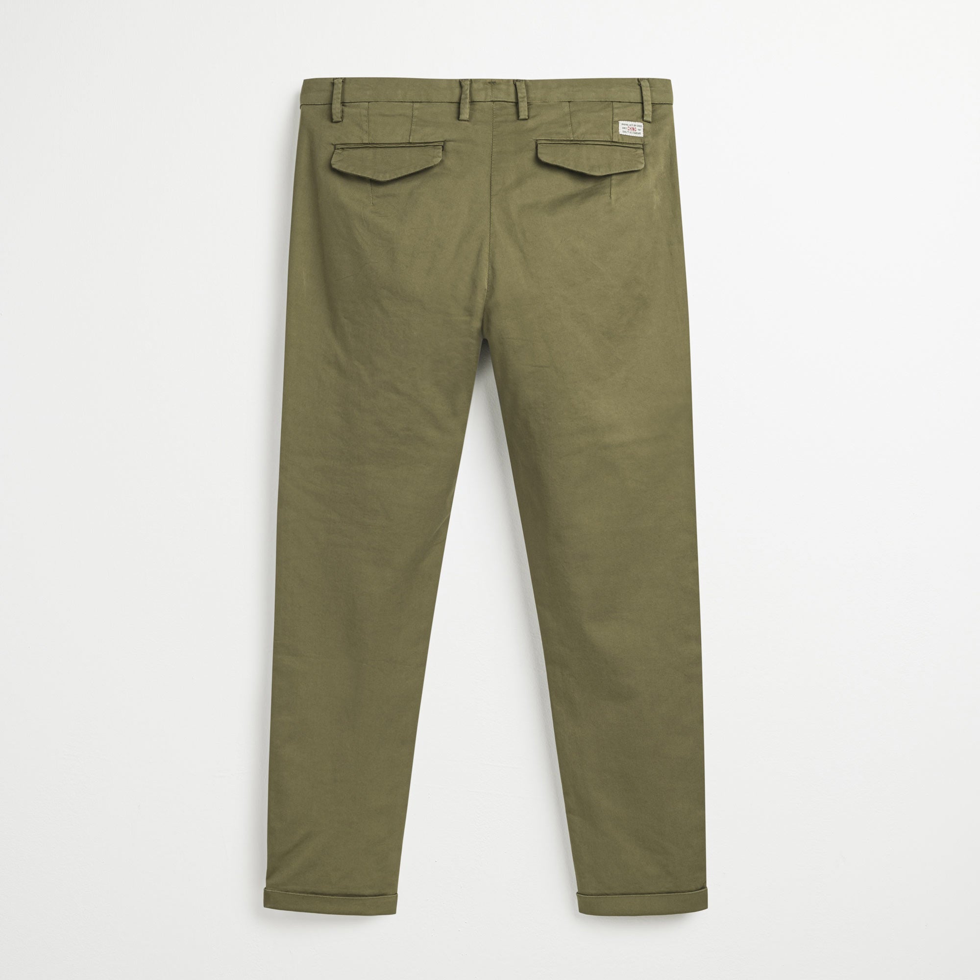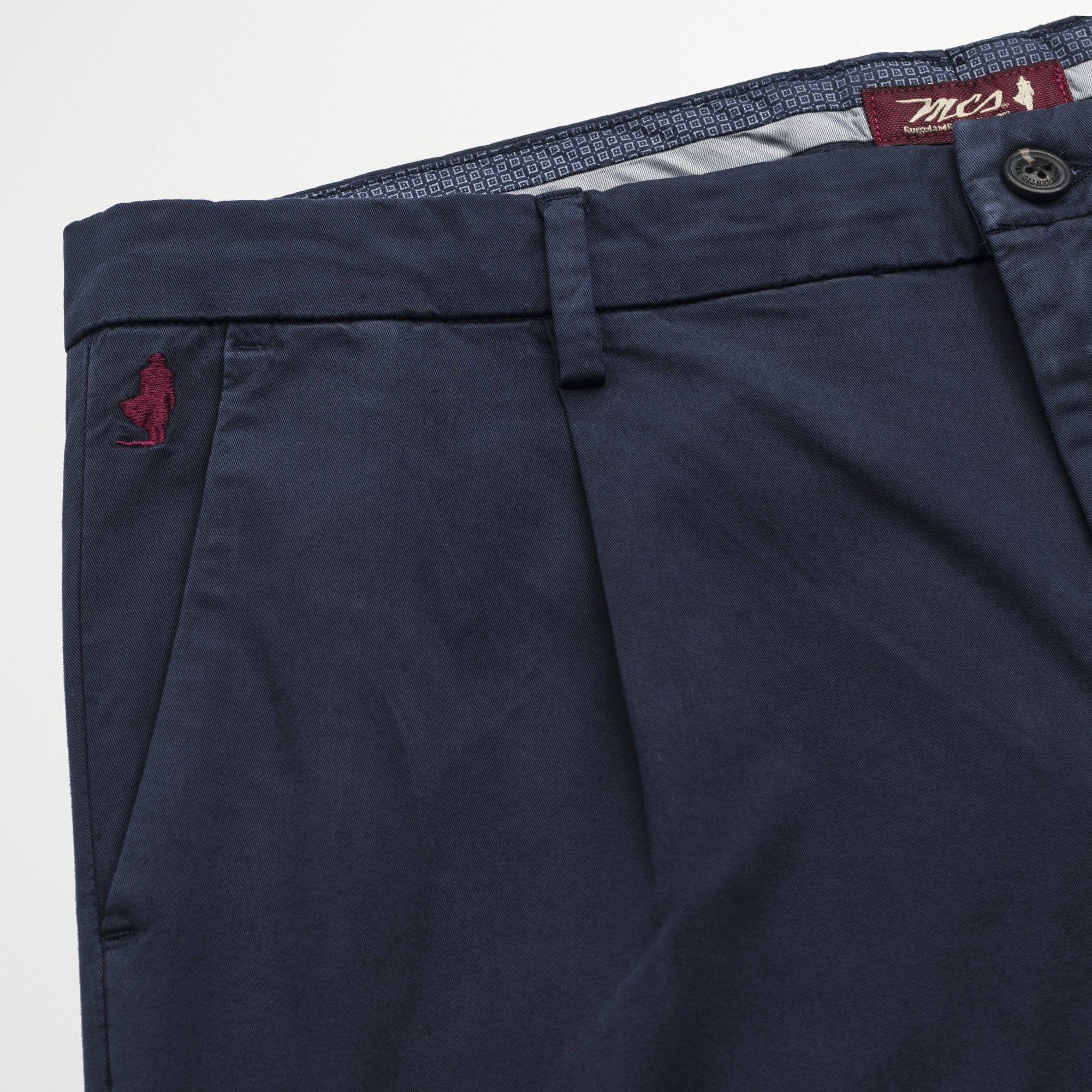 Pantalone chino con pinces in twill stretch tinto capo, caratterizzato da una vestibilità relaxed che garantisce massimo comfort e libertà di movimento. Le pinces donano un tocco sartoriale, valorizzando la silhouette con un'eleganza naturale. Il tessuto in twill elasticizzato assicura resistenza e morbidezza, rendendolo perfetto per un look raffinato ma rilassato. Il ricamo Rider MCS sulla tasca destra aggiunge un dettaglio distintivo, mentre il lavaggio enzimatico conferisce una mano estremamente morbida e piacevole al tatto.